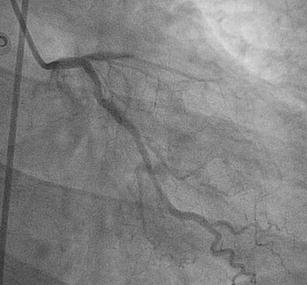 The ECG shows ST elevation in leads I, II, aVL, and V1–V6 representing acute myocardial infarction of the anterolateral wall. Coronary angiogram showed an occlusion of the mid left anterior descending artery (LAD) (Fig. 2). After reperfusion it became clear that the LAD passed over the apex, explaining the ST elevations in the inferior leads.