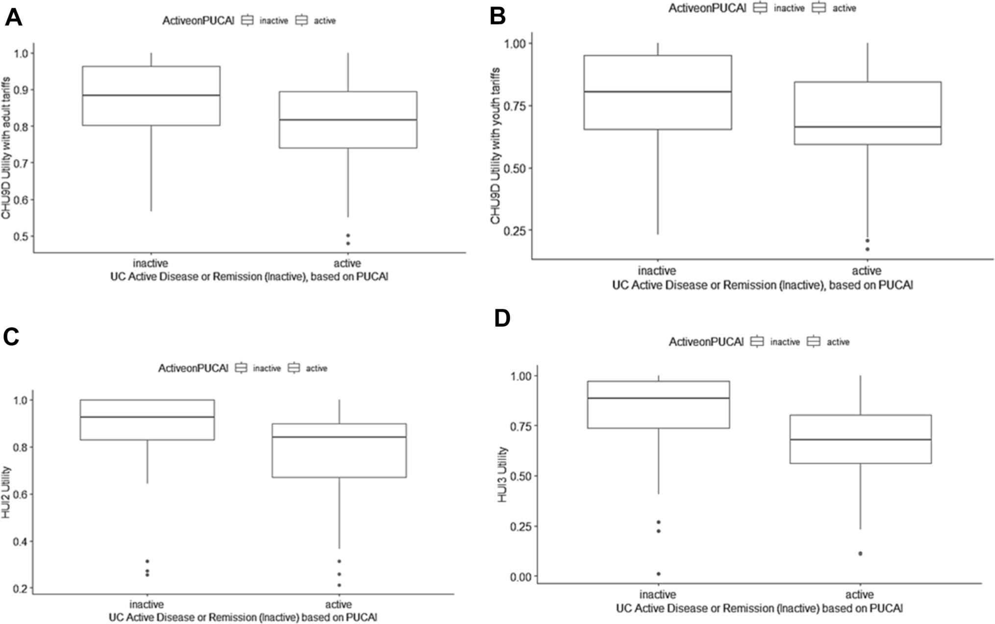 Preference-based instruments were administered to 188 children with CD and 83 children with UC aged 6 to 18 years. Utilities were calculated using CHU9D adult and youth tariffs, and HUI2 and HUI3 algorithms in children with inactive (quiescent) and active (mild, moderate, and severe) disease. Differences between instruments, tariff sets and disease activity categories and were tested statistically.