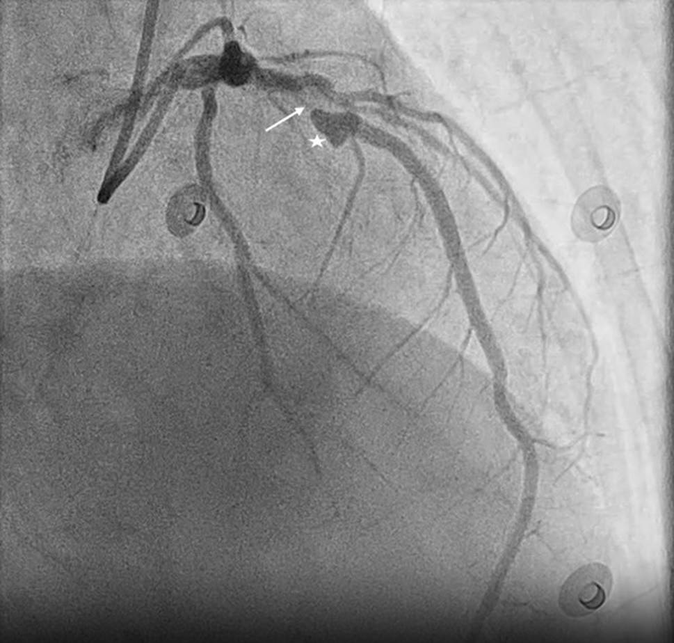 Heart-shaped coronary artery aneurysm indicated by a star, left anterior descending indicated by an arrow