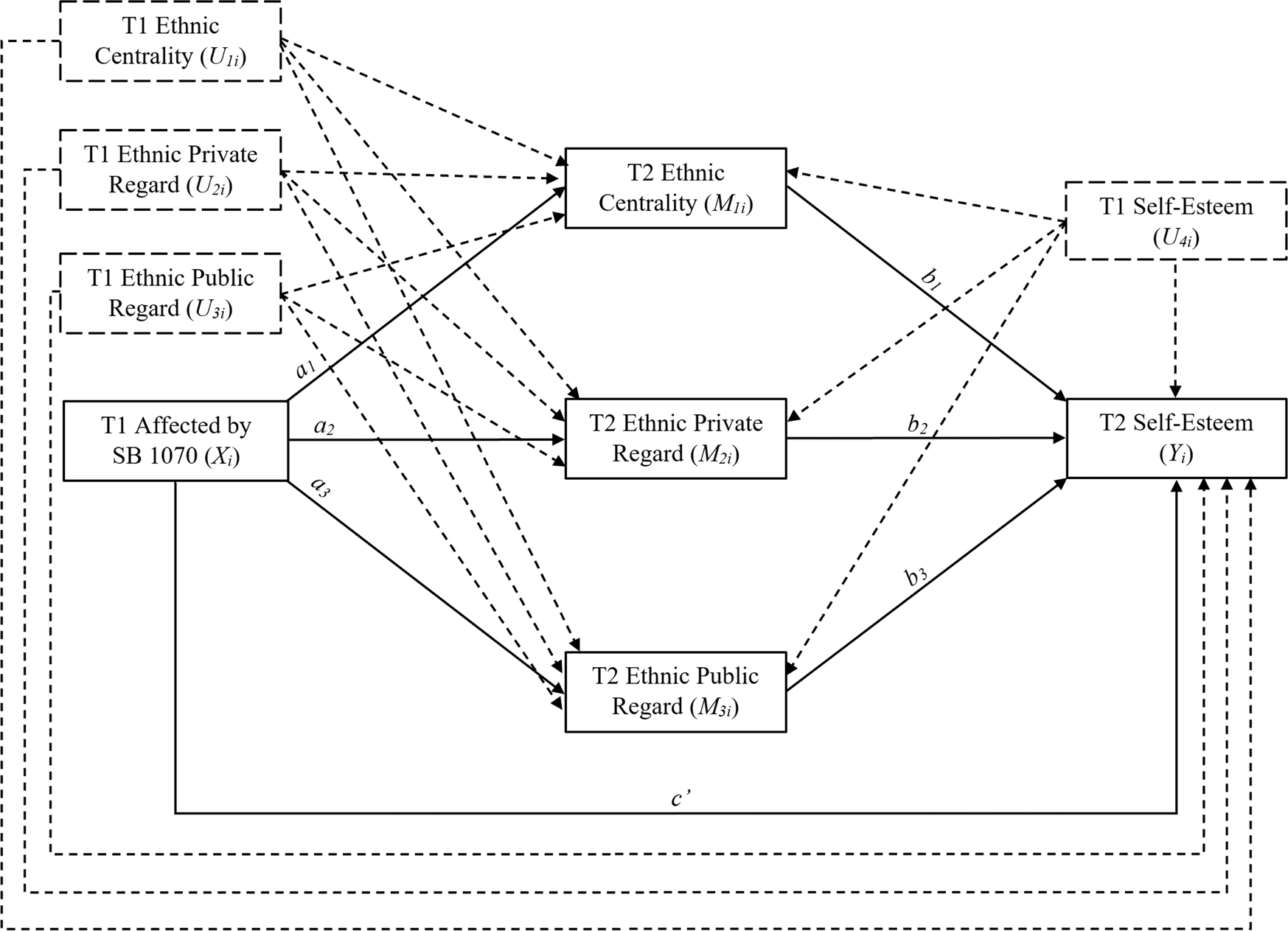 The following equations are represented in Fig. 1: \(\hat M_{1i}\) = iM1 + a1Xi + u1U1i + u2U2i + u3U3i + u4U4i (T1 affected by SB 1070 predicting T2 ethnic centrality); \(\hat M_{2i}\) = iM2 + a2Xi + u1U1i + u2U2i + u3U3i + u4U4i (T1 affected by SB 1070 predicting T2 ethnic private regard); \(\hat M_{3i}\) = iM3 + a3Xi + u1U1i + u2U2i + u3U3i + u4U4i (T1 affected by SB 1070 predicting T2 ethnic public regard); and, Ŷi = iY + c’Xi + b1M1i + b2M2i + b3M3i + u1U1i + u2U2i + u3U3i + u4U4i (T1 affected by SB 1070 predicting T2 self-esteem via T2 ethnic centrality, T2 ethnic private regard, and T2 ethnic public regard as parallel multiple mediators). Also included in the analyses was a test of the total effect, as expressed by the following equation (not depicted in Fig. 1): Ŷi = c0 + c1Xi + c2U1i + c3U2i + c4U3i + c5U4i. To control for the effects of repeated measures of the dependent variable and mediating variables over time, measures at T1 of self-esteem (α = 0.83), ethnic centrality (α = 0.83), ethnic private regard (α = 0.85), and ethnic public regard (α = 0.75) were included in the above equations as predictors of all mediating and outcome variables at T2. Each control variable was measured using the same items and scales as for the target variables.