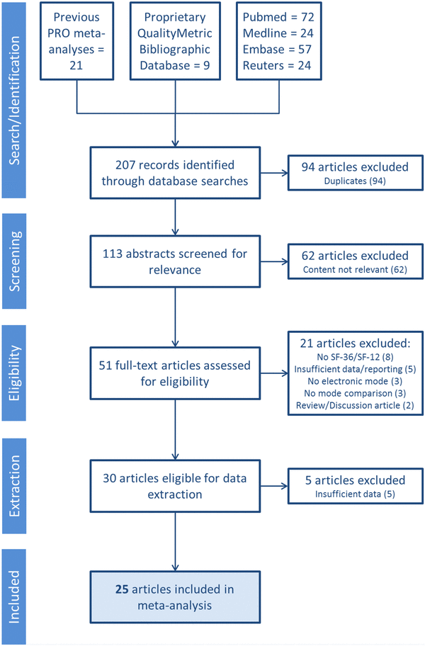 A comprehensive literature search was conducted to identify published manuscripts that examined measurement equivalence between paper and electronic versions of the SF-36 and SF-12 (see Fig. 1 for diagram of selection process). First, databases of medical literature, including PubMed, Embase, Medline, and Reuters were searched for peer-reviewed articles, conference proceedings, or published abstracts that included titles or abstracts that fit the following search string: [SF-36 or SF-12] and [Internet or touchscreen or web or tablet or computer or electronic] and [paper] and [compar* or equiv*] and [questionnaire]. Asterisks were used to capture multiple words that have the same stem (e.g., equivalent, equivalence), and several variants of the terms SF-36 and SF-12 were used to find articles that used different naming conventions for the survey (e.g., SF36, short form 36, SF12, short form 12). The searches were conducted in October 2016 and were not limited by year of publication. Second, the same terms were used to search a bibliographic database maintained by Optum that houses more than 29,000 publications that report using various SF Health Surveys. Third, the three previous meta-analyses were also screened for publications that used the SF-36 or SF-12 to ensure no studies were missed by the first two searches. This combination of search strategies identified 113 unique publications. The reference sections of these 113 publications were also screened to further ensure that no relevant publications were missed, though this did not result in inclusion of any additional articles. To be included in the meta-analysis, studies had to be published in English, contain a sample of adults (≥ 18), use a paper to electronic migration of either the SF-36 or SF-12 (v1 or v2), and test measurement equivalence using one of two indices: (1) mean differences; (2) agreement [i.e., intraclass correlation coefficient (ICC), Pearson product-moment correlation, Spearman rho, weighted kappa]. Studies examining only paper to interactive voice response (IVR) migration were excluded. Sixty-two studies were excluded for not meeting these criteria after abstract review, with an additional 21 articles excluded after full-text review. Five additional articles did not include sufficient statistical information and were consequently excluded during data extraction, resulting in a total of 25 articles for inclusion in the meta-analysis.