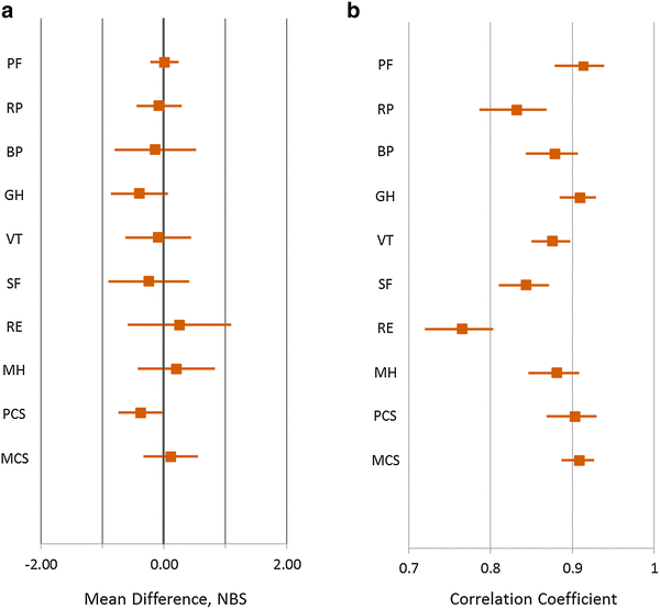 The results of the meta-analysis of agreement for each domain and summary score are shown in a forest plot (Fig. 2b), with point estimates and CIs for each of the domains and summary scores. The estimates ranged from 0.76 (RE) to 0.91 (PF), though the next lowest after RE was 0.83 (RP). For all scales, the 95% CI was above our specified criterion of 0.7. The summary scores, PCS and MCS, each had estimated correlation coefficient value of ~ 0.90.