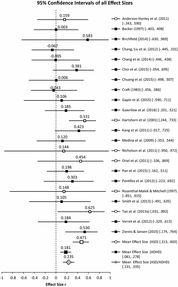 A forest plot displaying the effect sizes and confidence intervals of studies included in the meta-analysis. Note All effect sizes are corrected to 3 decimal places. Mean effect sizes for ASD and/or ADHD are based on the random-effects model. Open square box ASD studies. Filled square box ADHD studies
