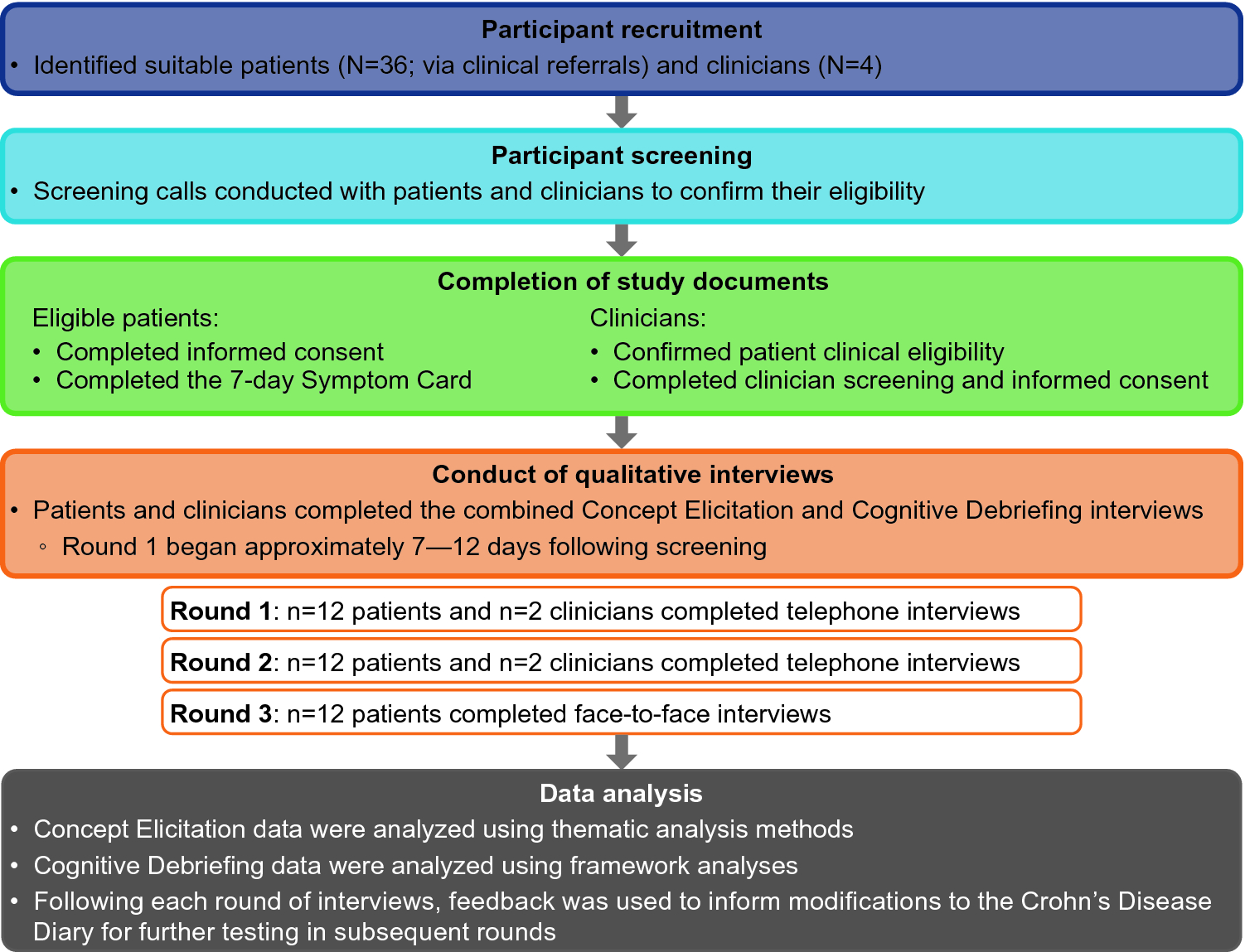 A conceptual model of relevant symptoms experienced by patients with Crohn’s disease was developed following a literature review. Three rounds of combined qualitative semi-structured concept elicitation and cognitive debriefing interviews with 36 patients (≥ 16 years) with Crohn’s disease and 4 clinicians were conducted to further explore the most commonly reported and most bothersome symptoms to patients. Interview results were used to update the conceptual model as well as items and response options included in The Crohn’s Disease Diary, a new PRO measure.