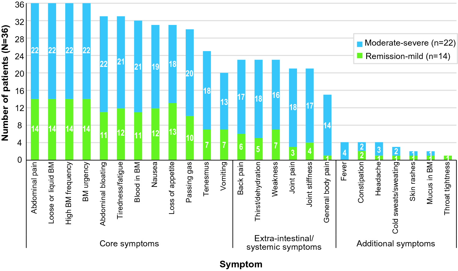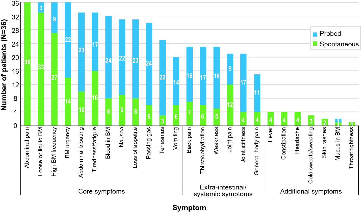 All patients (N = 36) reported abdominal pain, loose or liquid bowel movements, and high or increased frequency of bowel movements, with most reporting these symptoms spontaneously (100%, 92%, and 75%, respectively). All patients reported bowel movement urgency, but 61% reported this symptom only when probed. Most also reported that symptoms impacted activities of daily living, work/school, and emotional, social, and physical functioning (overall, 78%–100%; spontaneously, 79% – 92%). Data regarding core symptoms of Crohn’s disease from clinician concept elicitation interviews supported patient data. The 17-item Crohn’s Disease Diary assesses core symptoms and impacts of Crohn’s disease over 24 h, and extraintestinal manifestations over 7 days. The content validity of the diary was confirmed during cognitive debriefing interviews.