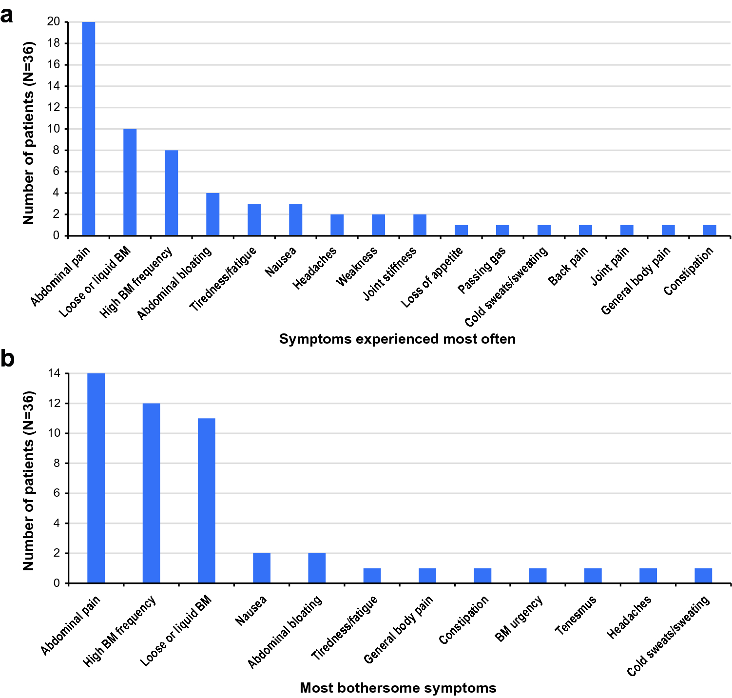 A total of 36 patients (n = 12 in each round) were interviewed and all sampling quotas were met. The mean age was 40.5 years (range: 16–74 years), there were slightly more females (21/36 [58%]) than males, and most patients were White/Caucasian/European (24/36 [67%]) (Table 1). Nearly two-thirds (22/36 [61%]) of patients were categorized as having moderate to severe Crohn’s disease. Time since diagnosis ranged from 6 months to 20 years and the sample was diverse in terms of location of disease (ileum, 25/36 [69%]; proximal small bowel 22/36 [61%]; colon, 22/36 [61%]; esophagus/stomach, 27/36 [44%]).