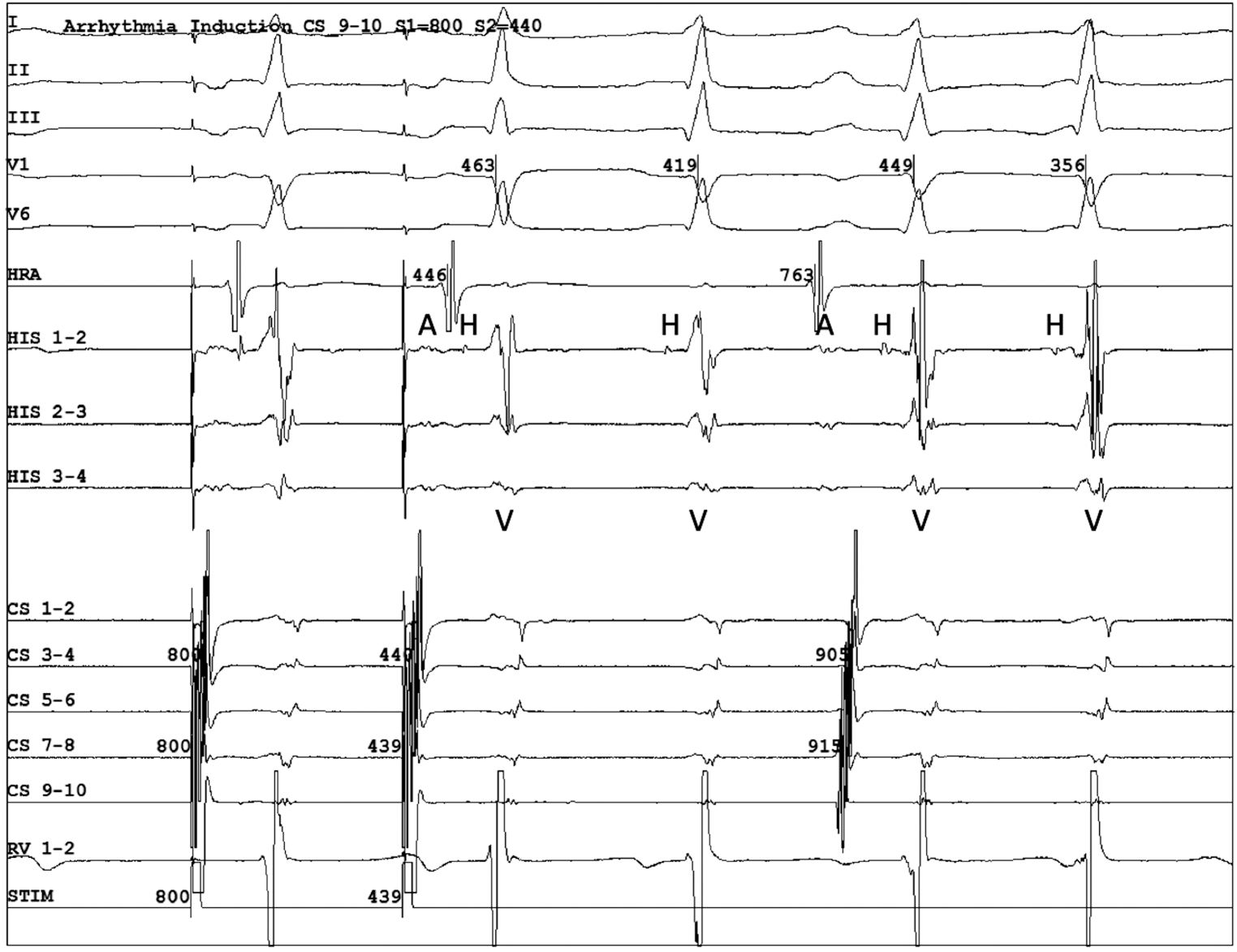 Electrophysiological study confirming ‘double firing’ phenomenon. This occurred after a programmed atrial extrastimulus and also during the subsequent sinus beat. Note that one atrial complex (A) is followed by a dual ventricular response preceded by a corresponding His potential (H). The conduction delay between the fast and slow pathway was 356 ms. A atrium, CS coronary sinus, H His potential, HRA high right atrium, RV right ventricle, V ventricle