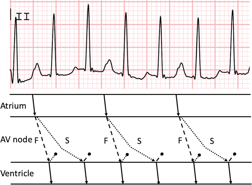 Putative mechanism of DAVNNT. a ECG demonstrating DAVNNT in our patient. One P wave is followed by two QRS complexes. The cycle length between P waves is 640 ms. Note that the P waves are positive in lead II ruling out a retrograde P wave; b Sinus beats are conducted anterogradely via the fast (dashed line) and slow (dotted line) pathways from the AV node. There should be a critical delay in the slow pathway to allow recovery of refractoriness in the His-Purkinje system following activation by the fast pathway. Furthermore, there is retrograde unidirectional block in both pathways (denoted by black dot). F fast pathway, S slow pathway
