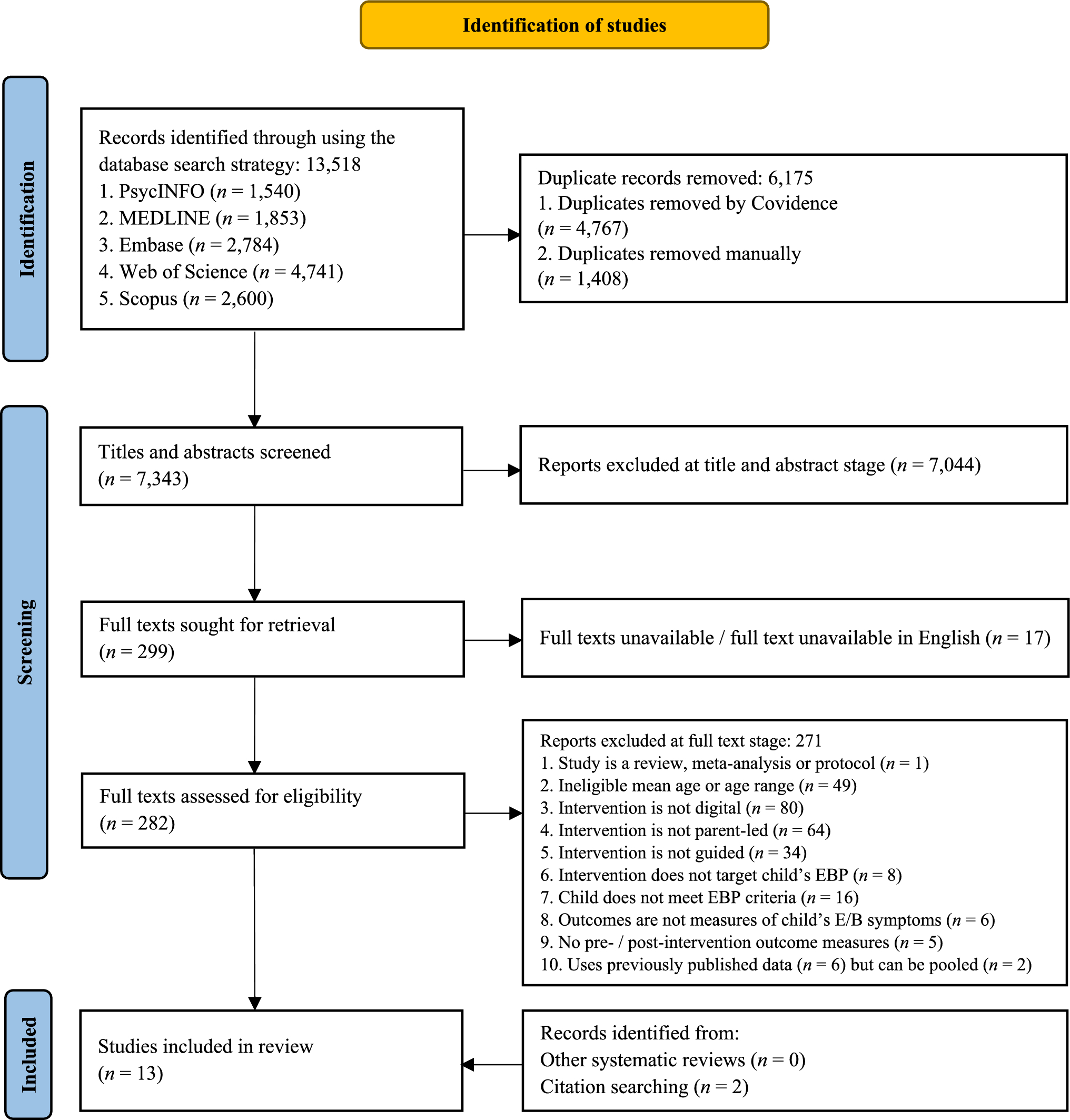 In addition to the 13 studies included in the review, three studies (Högström et al., 2015; A. Sourander et al., 2018; S. Sourander et al., 2024) were identified as providing longer term follow-up data relating to included studies. Data from these studies were included in the synthesis of the study outcomes.