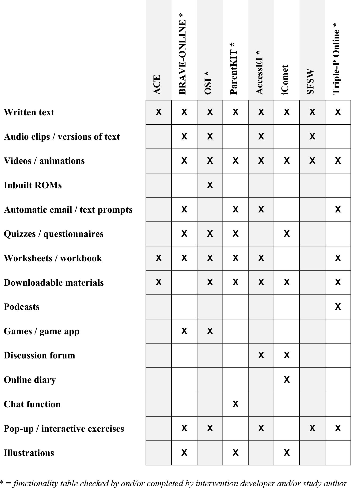 Studies often failed to report clear details concerning the proportion of participants who completed each module, and some did not report such information at all, instead only reporting retention to the study measures. As noted by MacDonell and Prinz (2017), inconsistencies with regards to how completion rates are reported across studies makes it difficult to gain a full picture of adherence to the interventions, however it did appear that drop out from treatment was an issue for many of the interventions, particularly those addressing anxiety problems.