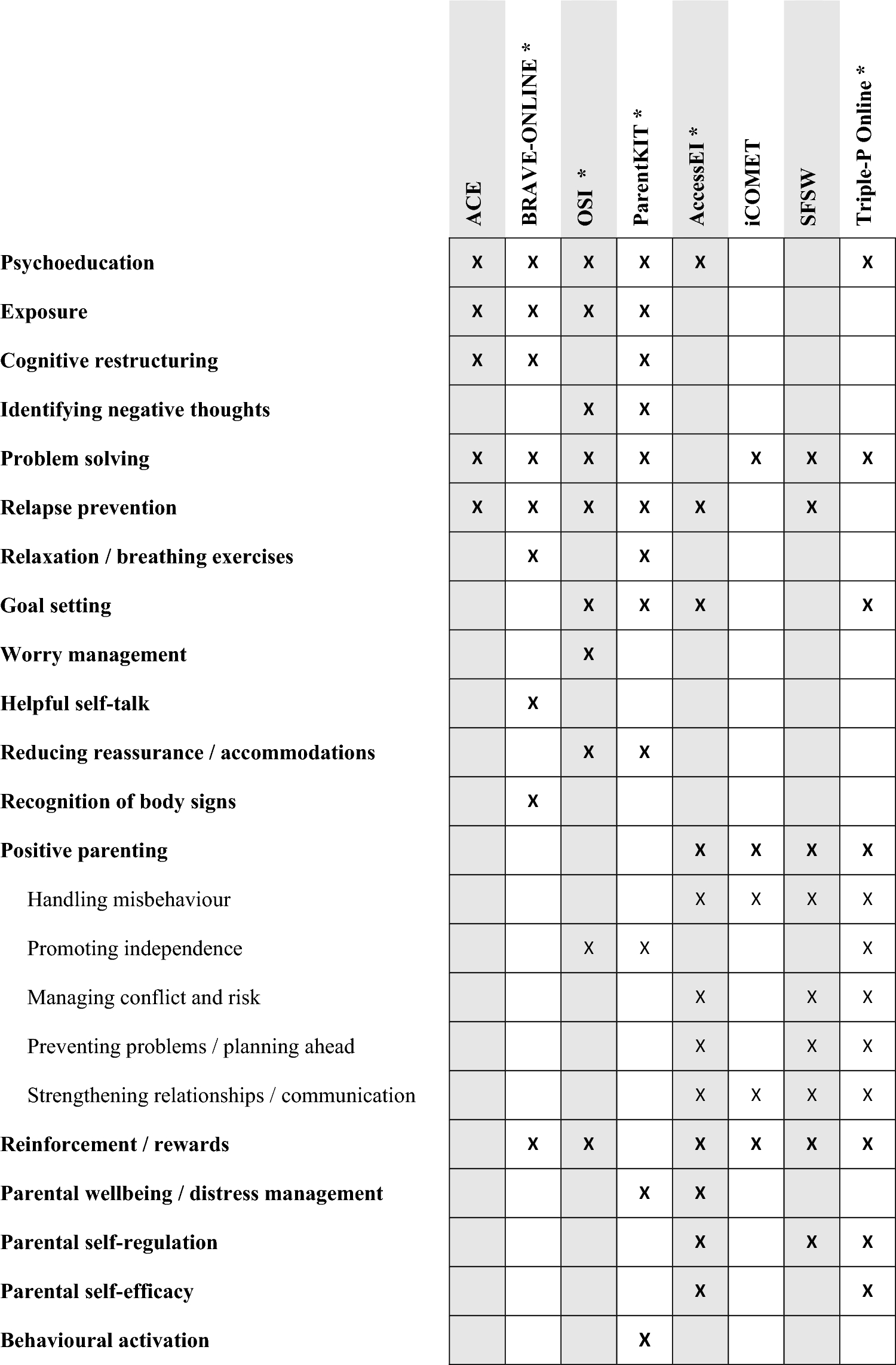 Along with the components and functions of the interventions, when developing new interventions for this population, it is useful to consider other elements, such as intervention length and the type of guidance offered. This varied substantially across the included interventions, with some only providing guidance once during the course of treatment, and others providing it after every module, or throughout treatment on an ad-hoc basis. In terms of the actual time this took facilitators in total over the course of the intervention, Triple-P Online had the shortest total recommended guidance duration of only 40 min, compared with AccessEI, where guidance could last up to 600 min. Generally, these durations represent a large time saving compared to traditional face-to-face treatments, bringing potential to increase treatment accessibility. One exception was AccessEI, in which, whilst there may have been accessibility benefits from the remote approach, the total overall treatment time was significantly greater than the face-to-face comparator treatment. Furthermore, several of the interventions did not require the guidance to be provided by a highly qualified or trained professional, with students, research assistants and trainees frequently providing support to parents, again bringing potential to increase accessibility by not requiring highly specialised therapists who are not widely available in many settings.