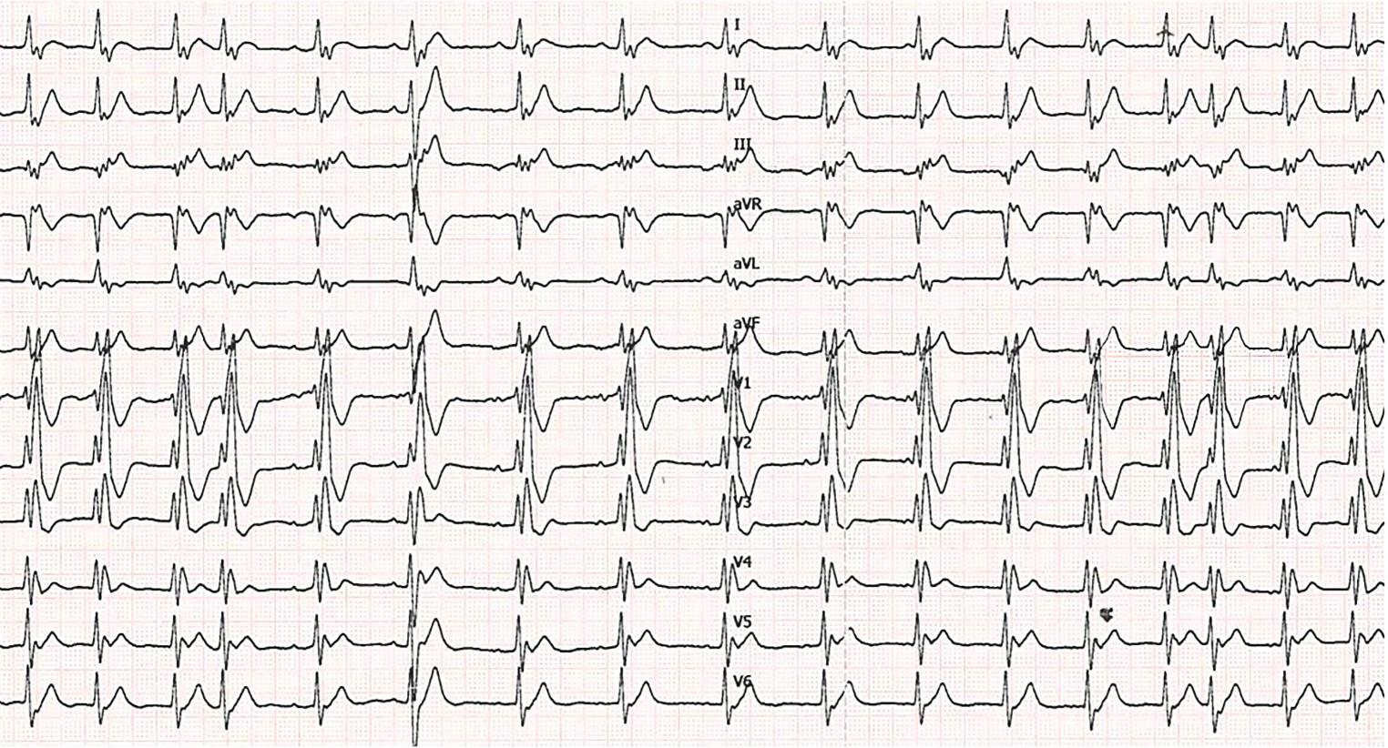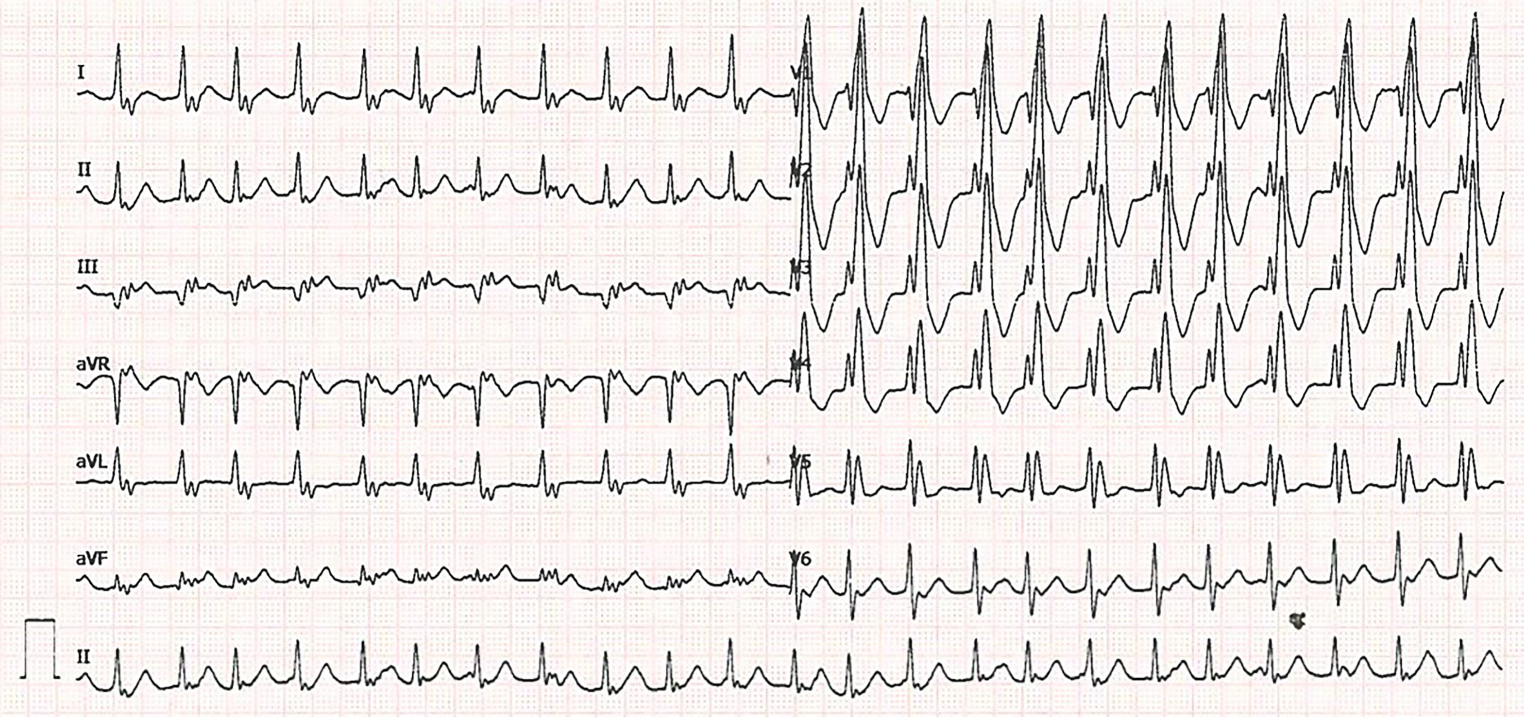 A 24-year-old man presented to the emergency department complaining of palpitations. The symptoms had lasted for up to 4 h. He is known to have a 22q11.2 microdeletion (DiGeorge syndrome) as well as tetralogy of Fallot, for which surgical correction was performed in 1998. The patient has a mild cognitive impairment but no other clinical features of the DiGeorge syndrome. Furthermore, in 2017 the patient underwent a pulmonary homograft due to valve insufficiency combined with closure of a patent foramen ovale. Previous electrocardiograms (ECGs) showed a complete right bundle branch block with a similar QRS morphology to the current ECG during tachycardia. His only current medication is acetylsalicylic acid 80 mg once daily. The initial ECG (Fig. 1) was performed on his arrival at the emergency department. The second ECG (Fig. 2) was performed after intravenous administration of 12 mg adenosine.