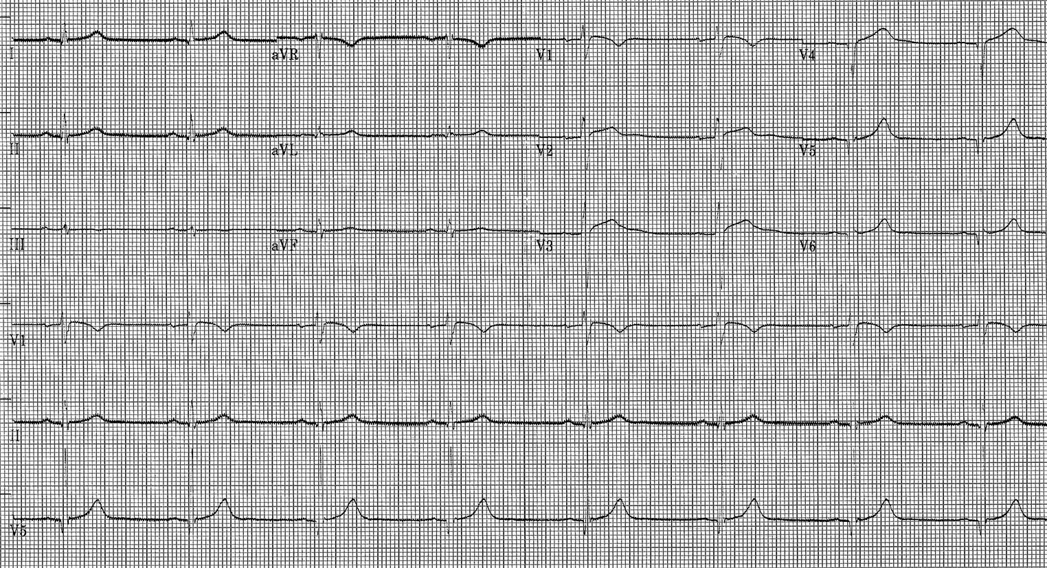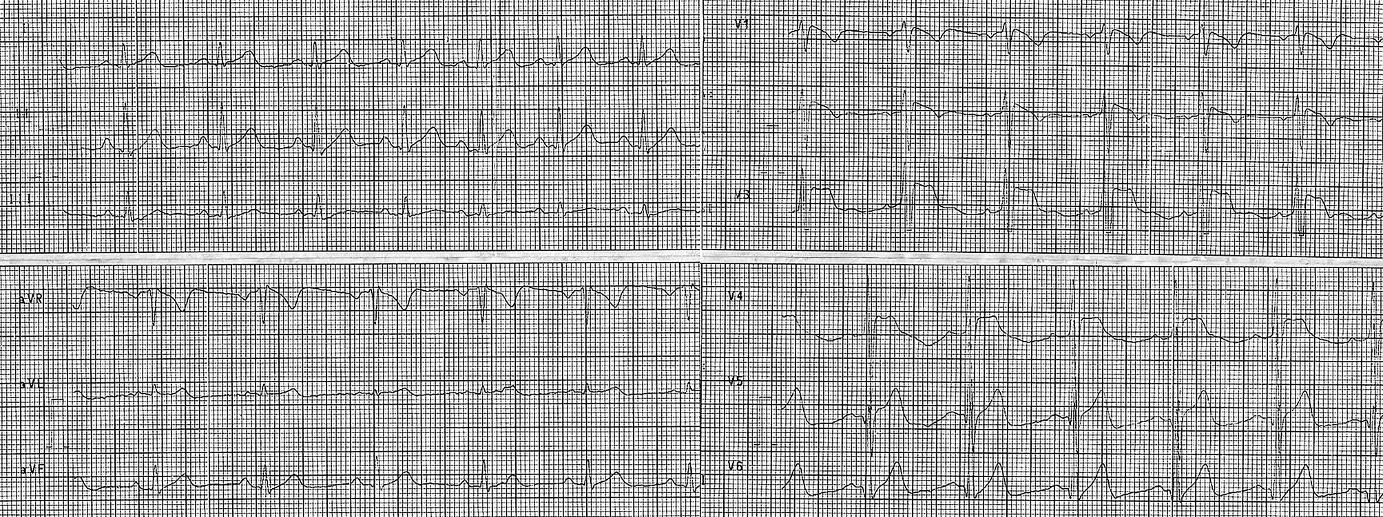 Out-of-hospital electrocardiogram (ECG) shows a sinus rhythm of 85 beats per minute (bpm), narrow QRS complex, and ST-segment elevations in leads V1–V4 (coved morphology in V1–V2), with a terminal negative T wave in V1–V2 (Fig. 1). ECG findings could be suspicious for acute anteroseptal myocardial infarction, but reciprocal ST-segment changes are lacking. The ECG is also suggestive of a coved-type Brugada-like pattern, and the patient had no history of syncope or any other cardiac symptom, nor a family history of unexplained sudden cardiac death.