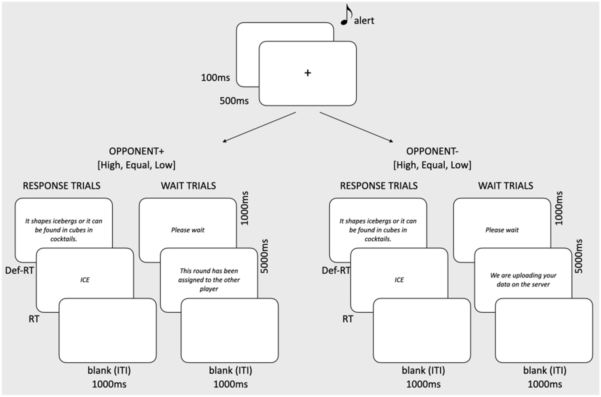 Participants were assigned to one of six experimental conditions based on recruitment order. Participants in the Opponent + groups were informed that they would play against another participant (2-players), whereas participants in the Opponent- groups were told they would perform individually (1-player). In truth, a second player was never present. All participants responded to the same number of trials (‘response’ trials). Conversely, the number of ‘wait’ trails varied according to condition. Participants in the High condition were kept on hold less frequently than participants in the Equal and Low conditions (who were administered twice the amount of ‘wait’ trials experienced by those in the High condition). The number of participants included in each condition is reported in the rightmost column (N)