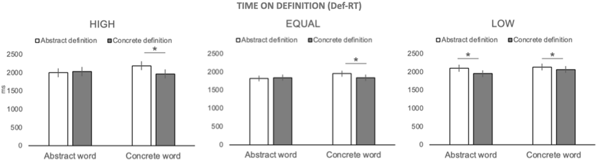 For each word, two different definitions were created, for a total of 80 definitions. One definition, i.e., concrete definition (Cd), described the concept mainly by means of perceptual attributes or real-world examples. Conversely, the second definition, i.e., abstract definition (Ad) described the target concept using a theoretical framework or taxonomic relations. For example, the two definitions for ‘freedom’ were as follows: Cd, “Those in prison or in slavery are deprived of it”; Ad, “The condition of a person not subject to constraints”. A pre-test was run to ensure that the selected definitions correctly captured the intended content and that Cd and Ad were perceived as different by the readers (see details in Appendix 1).