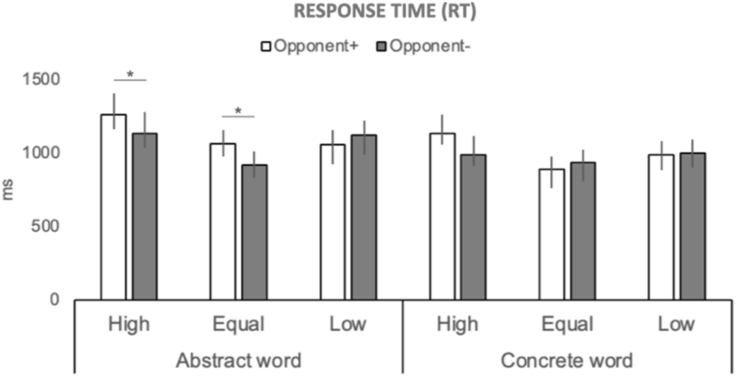 An additional 3-way ANOVA was performed with Definition (Ad, Cd) and Group (Opponent + /High, Opponent + /Equal, Opponent + /Low, Opponent-/High, Opponent-/Equal, Opponent-/Low) as within-item factors and Word (Aw, Cw) as between items factor. Overall, this analysis replicated the reported findings, although here the interaction Word x Group just failed to reach significance, F(5,90) = 1.93, p = .09. Note that this additional analysis was performed solely on RTs relative to matching pairs (i.e. “b key-press” responses) because in non-matching pairs two different concepts were involved, which could create a confound for this type of analysis. By halving the number of entries however, power could have been reduced.