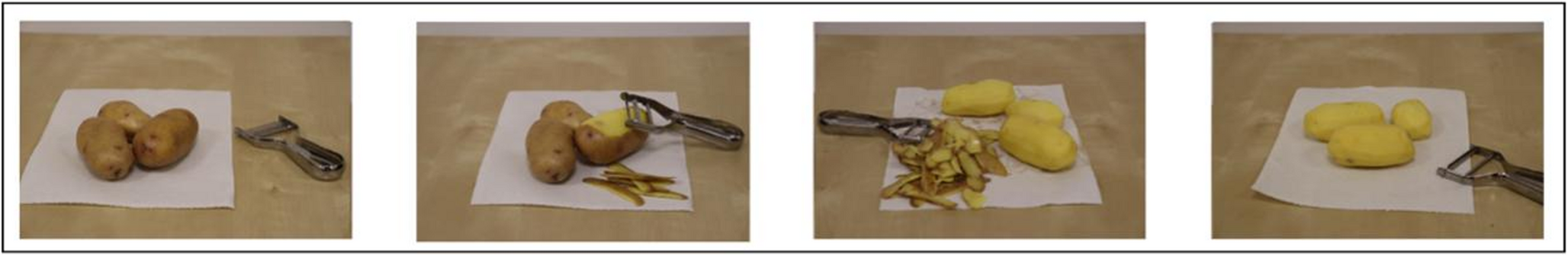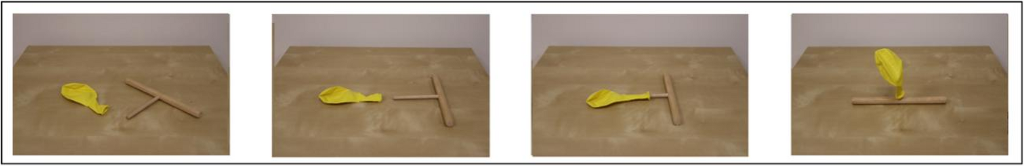 The sequences of pictures resembling the instrumental actions were taken in our lab, each involving the manipulation and interaction of two objects on a table. Each action was captured in a series of four pictures (size: 300 × 211px) representing different stages of the action as it unfolds. Familiar actions consisted in everyday common actions with familiar goals and means (e.g., Fig. 2), whereas unfamiliar actions were characterized by an unclear and unfamiliar end-state (e.g., Fig. 3). None of the unfamiliar actions included elements associated with negative responses (e.g., an end-state producing damage or breaking the object). All the material, including the entire set of actions, can be downloaded from the following link: https://osf.io/uh4y3/?view_only=db53af7df0e042b49385050147388440.
