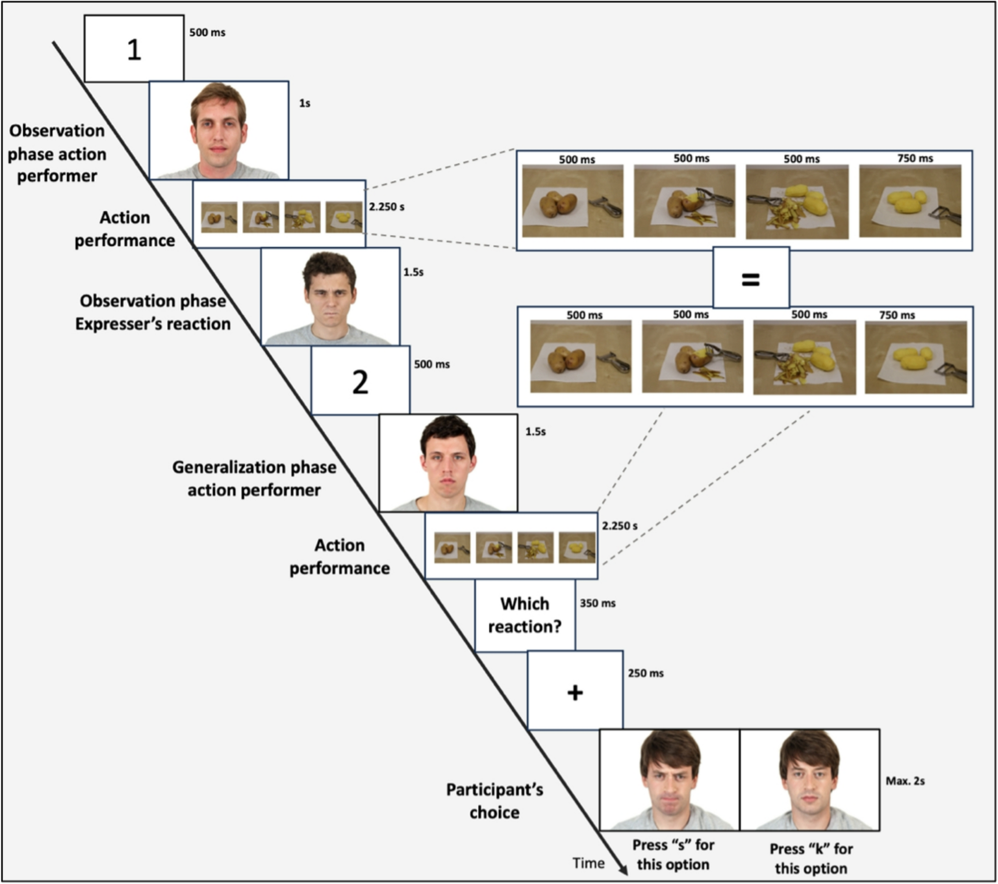 The generalization phase began with the number “2” appearing at the center of the screen for 500ms, followed by a 500ms pause. Participants were then shown a picture of a new individual who would perform the action (generalization phase performer) accompanied by the label “performer of the action” (all timing and stimulus sizes were the same as in the observation phase), followed by the same pictures resembling the action observed in the observation phase (i.e., to show the second performer completing the action). After the action had been shown, the prompt “which reaction?” appeared at the center of the screen for 350ms followed by a 200ms pause, asking participants to prepare to indicate which emotion they expect a new individual (generalization phase expresser) will display. A fixation cross then appeared for 250ms followed by a 100ms pause. Next, two pictures of the generalization phase expresser showing the two potential emotional displays appeared on the two sides of the screen, one showing a negative reaction and one showing a neutral reaction. These were pseudorandomized to appear equally on the left and right sides in a random order. Participants chose the expected display by pressing “s” (for the left) or “k” (for the right) on their keyboard. If the choice took more than 2000ms, the message “too slow” was shown in red capital letters for 500ms. After responding there was a 500ms pause before the beginning of the next trial. It was crucial to use pictures that clearly showed different individuals (observation phase performer; observation phase expresser; generalization phase performer; generalization phase predicted expresser) to ensure that the prediction of the emotional reaction in the generalization phase expresser would be related to an emotional evaluation of the action itself and to an emotional evaluation of the individual performing the action.