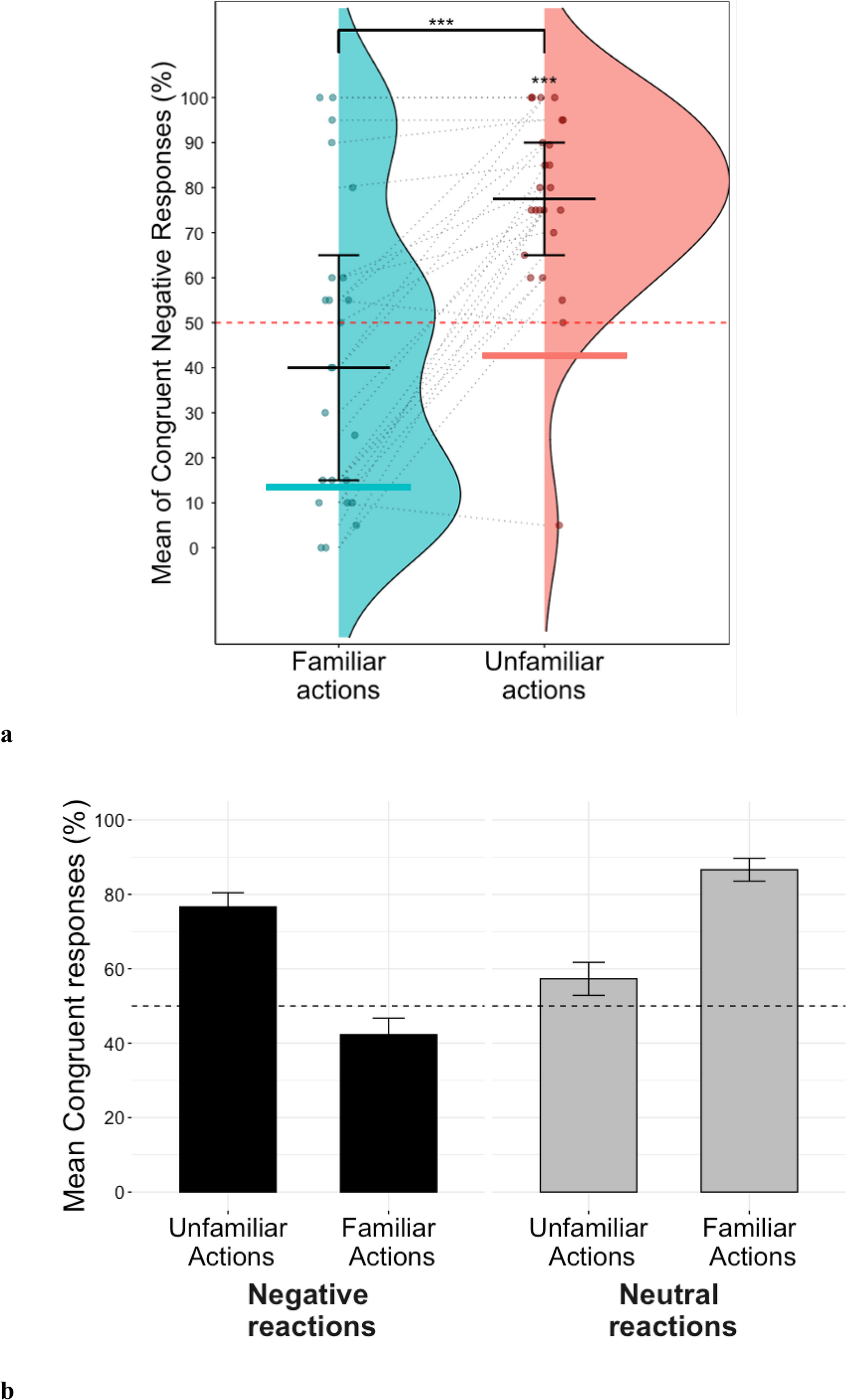 a Raincloud plots showing percentage of congruent negative responses for familiar and unfamiliar conditions. Dashed red line indicates chance level (50%). The two coloured segments indicate the baseline for expected negative reactions to familiar (13.43%) and unfamiliar actions (42.71%) respectively. b Barplots showing mean percentage of congruent responses for all conditions. Dashed red line indicates chance level (50%)