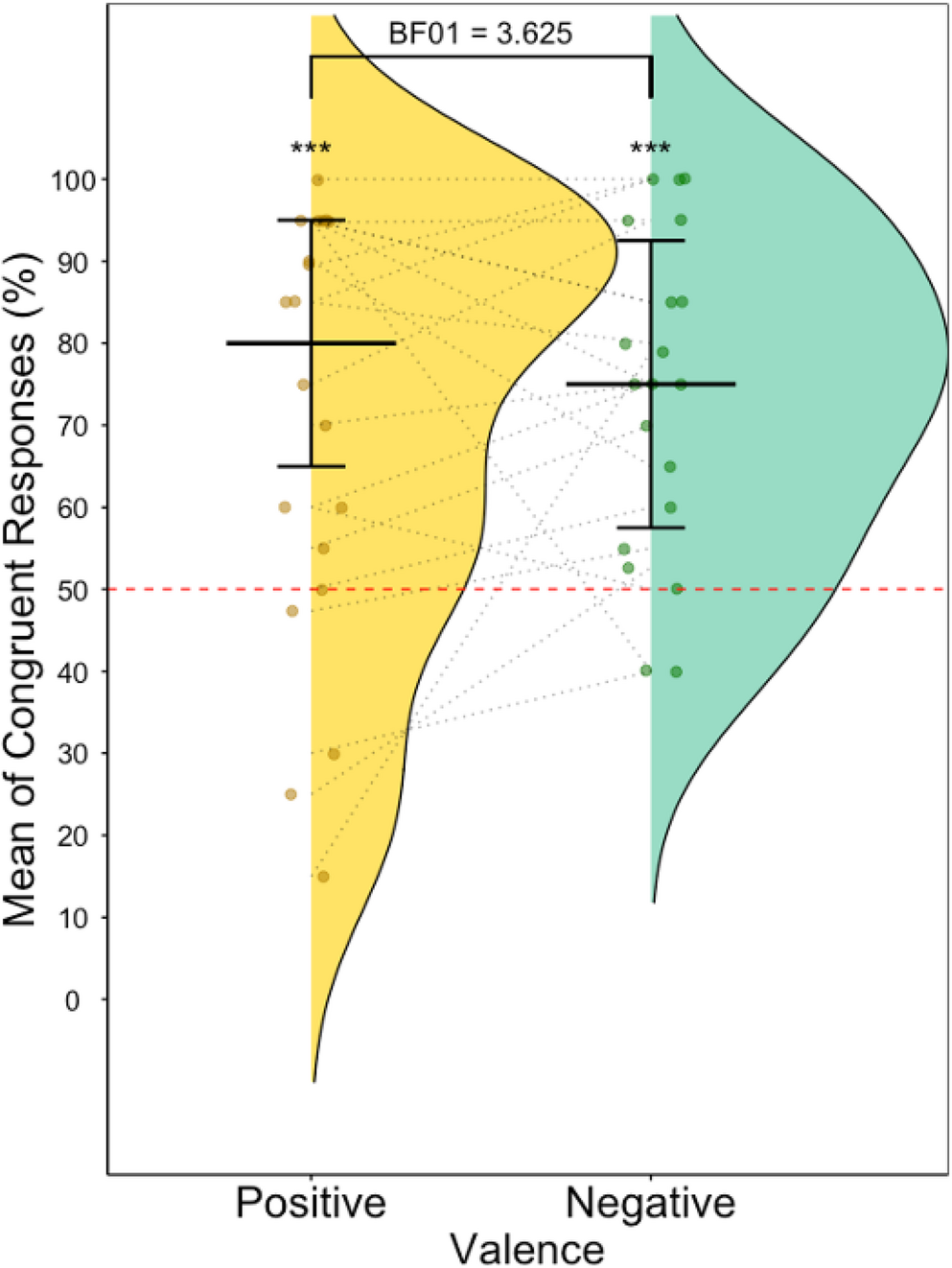 Raincloud plots showing percentage of congruent responses for positive and negative conditions. Red line indicates chance level (50%)