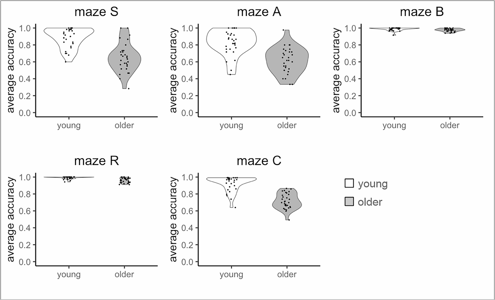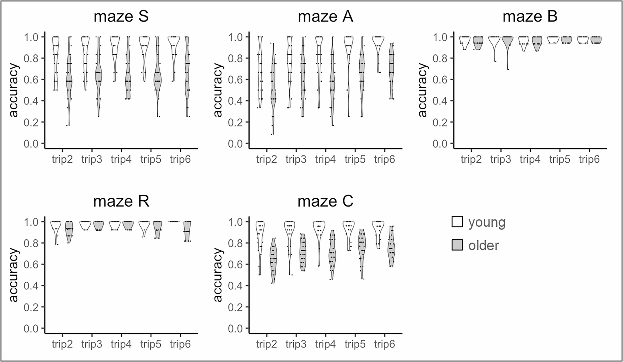 Distribution of average accuracy across trips for each maze and age group. Note: Each dot represents one participant; the width of the violin around the dots indicates the data distribution density.