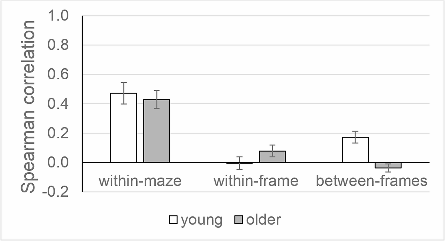 Each set of correlations was transformed using Fisher’s Z transformation and compared between ages by Mann–Whitney U test from the R package wilcox.test. Thus, rwithin-maze of older adults was compared to rwithin-maze of young adults, and accordingly for rwithin-frame as well as for rbetween-frames. Since maze B and R probably required little decision-making (Bock et al., 2024), the comparisons were repeated after eliminating data from those two mazes.