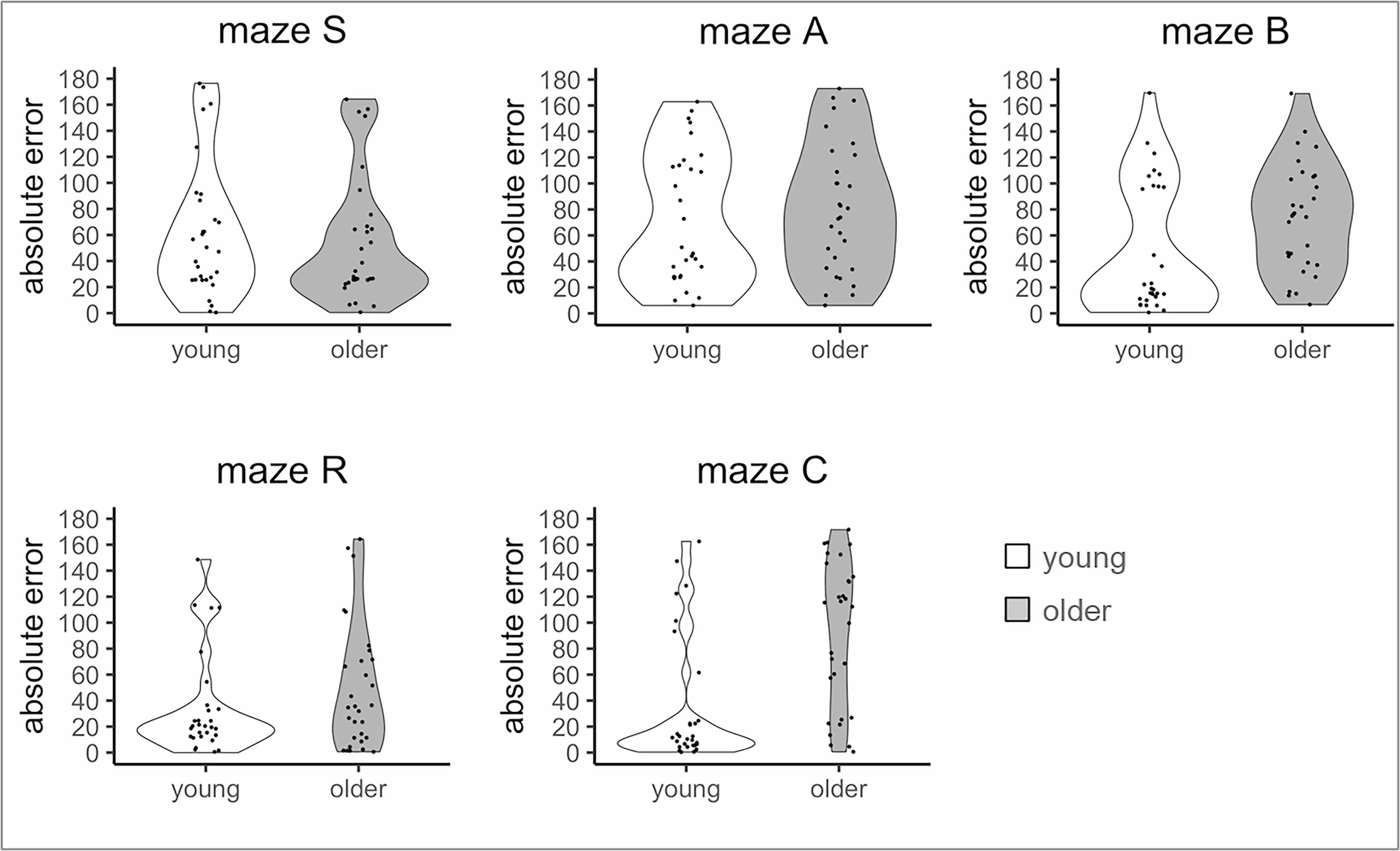 To address the resource competition hypothesis (H3), errors in the direction judgment task were analyzed by a Wald-type test with the dependent variable ‘absolute error’, the within-factor ‘maze’ (S, A, B, R, C) and the between-factors ‘age’ and ‘sex’. Post-hoc Dunn’s tests were performed to decompose a significant ‘maze x age’ term by comparing ages within each maze.