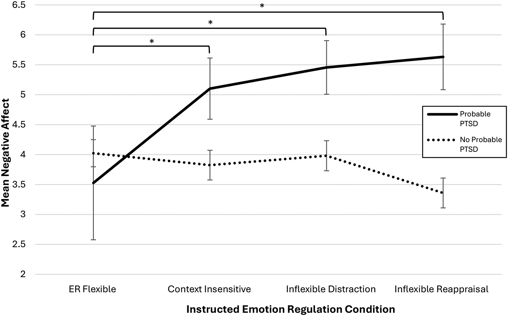 Participants with probable PTSD in the ER Flexible condition demonstrated the lowest levels of negative affect. For participants without probable PTSD, negative affect did not differ between the ER conditions.