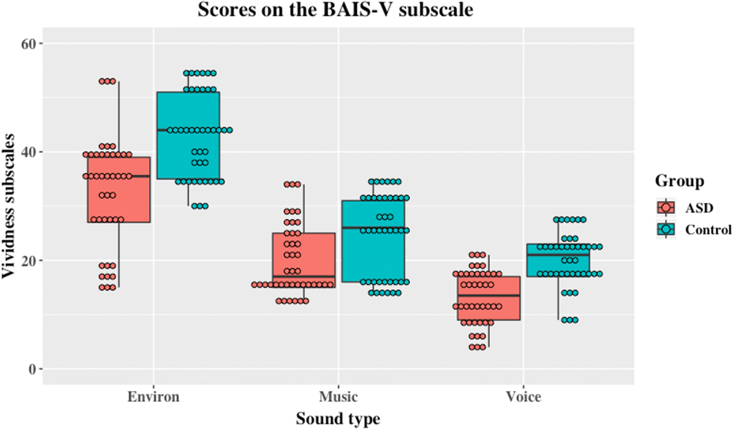 Scores on the BAIS-V subscale for ASD and control (typically developing) groups according to sound type