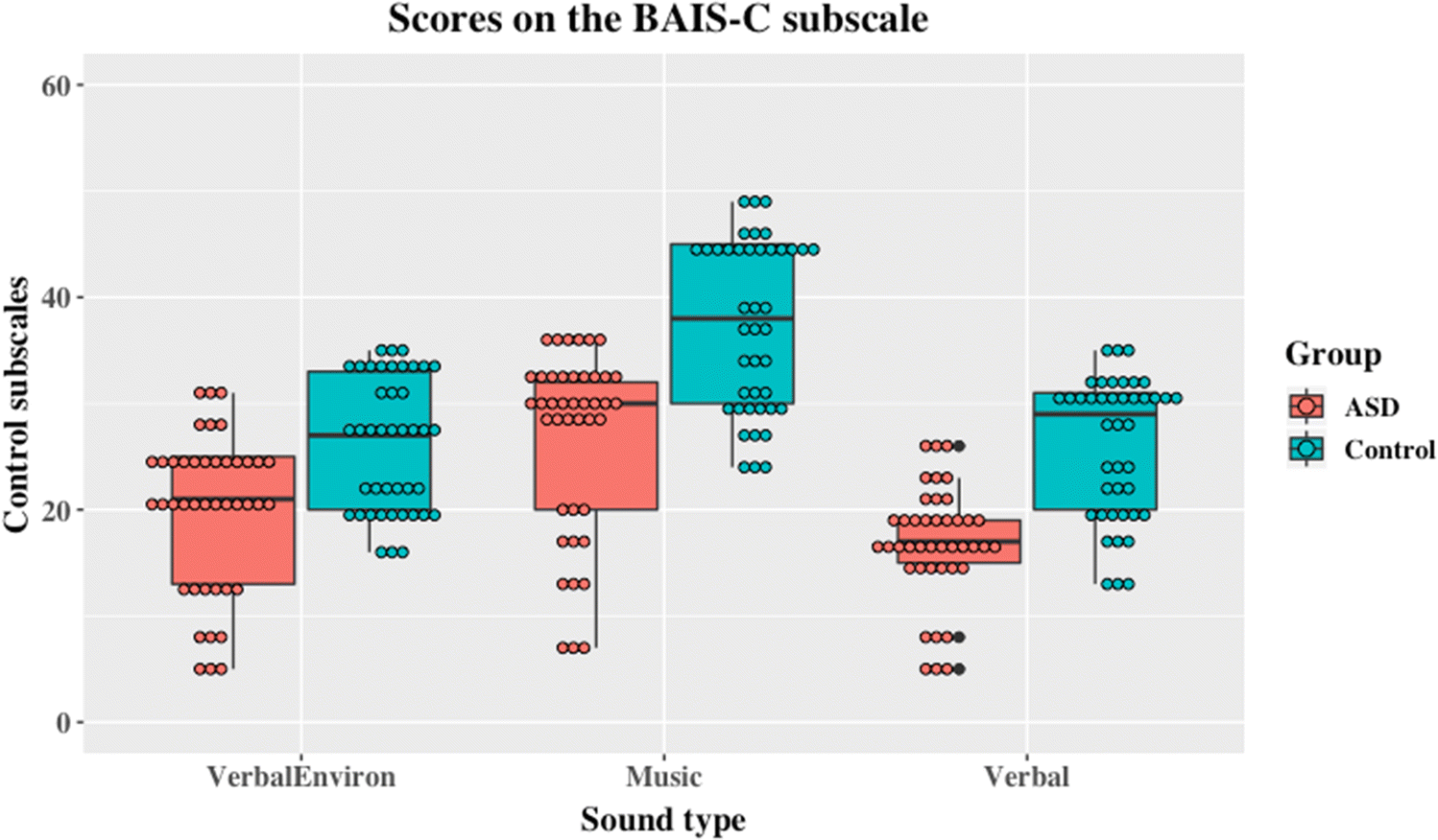 Scores on the BAIS-C subscale for ASD and control (typically developing) groups according to sound type