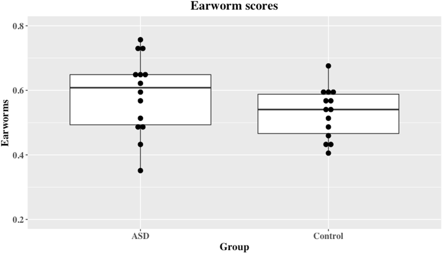 Finally, the control subscale of the BAIS positively correlates with the movement factor of Floridou et al. (2015) involuntary musical imagery scale and both vividness and control subscales of the BAIS correlated with the number of earworms, or involuntarily-experienced tunes, induced experimentally in a study reported by Beaman (2018). Earworms or, colloquially, songs stuck in the head are a common experience in the general population. Liikkanen (2012) found that 33% of a large internet sample reported experiencing earworms daily, with 90% experiencing the phenomenon at least once a week. People who listen to more music throughout the day have been reported to have less frequent earworms, but of similar durations to others (Williamson and Jilka 2014). Strong positive correlations have been found between practicing a musical instrument and earworm frequency (Liikkanen 2012), suggesting that expertise and/or training can have an effect on the appearance of earworms. Floridou et al. (2012) did not replicate these findings, but Beaman and Williams (2010) found that the self-reported importance assigned by individuals positively correlated with the appearance of earworms. Thus, it appears that engaging in music in some way is associated with experiencing earworms. Ockelford (2015) notes that, sensory reactivity issues notwithstanding, many children with autism seek out musical experiences. Ockelford (2015) also suggests that the mental imagery particularly of those ASD children who possess superior pitch perception (in particular, those with absolute pitch) might be more vivid if it allows for direct, rather than indirect, access to memories of the original percepts. The logic of this is somewhat against what is known about the reconstructive nature of memory (Schacter et al. 1998; Surprenant and Neath 2003). Ockelford notes that, based upon (albeit informal) clinical observational evidence of children with ASD repeatedly humming, singing or whistling snippets of tunes, “earworms are a relatively common feature among this population” (Ockelford 2015, p. 133). Thus, there is at least prima facie reason to believe there may be more earworms amongst an ASD group as a function of more vivid auditory imagery, reflected in higher scores on BAIS.