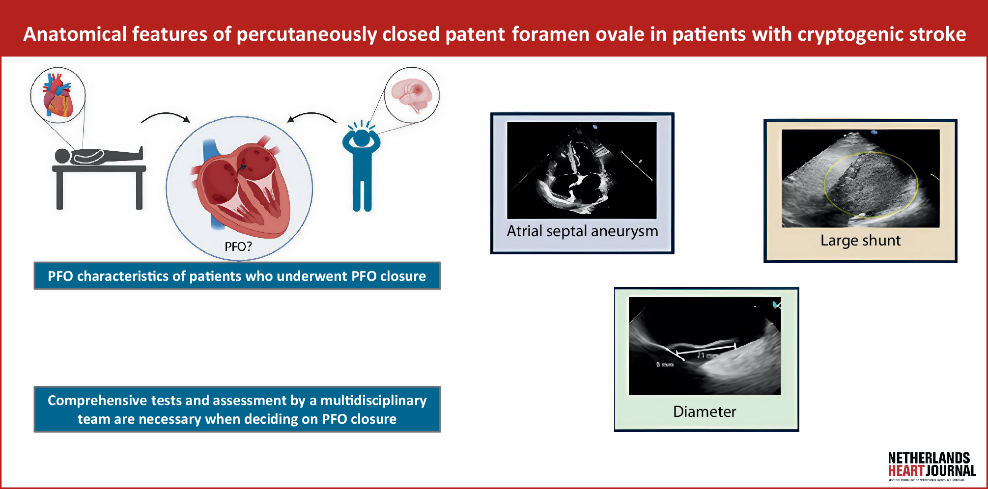 Patent foramen ovale (PFO) is increasingly recognized as a cause of stroke, with a prevalence of approximately 25% in the general population. Consequently, the likelihood of encountering a ‘bystander PFO’ in young patients who have experienced a stroke seems significant. To aid in identifying patients with a PFO-related cryptogenic stroke, an interdisciplinary Heart-Stroke Team (HST) has been established. This team evaluates patients who have suffered from stroke and were diagnosed with a PFO to assess its potential contribution. Understanding the anatomical features of PFOs associated with stroke is essential for decision-making. This study examines the PFO characteristics of all patients who underwent percutaneous PFO closure for cryptogenic stroke at two congenital heart disease institutions in the Netherlands.