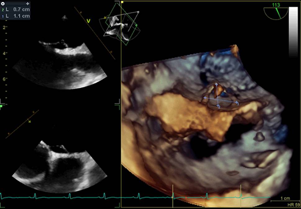 The results of TEE imaging were also recorded to further assess the PFO characteristics. Anatomical PFO characteristics were measured with standard TEE imaging (Epiq, Philips, Best, the Netherlands, and Vivid E95, GE Healthcare, Horten, Norway). The PFO size was measured with two-dimensional TEE before PFO intervention as an “unstretched diameter” in 114 patients (Fig. 2) or with three-dimensional TEE during PFO intervention, after placement of a guidewire through the PFO, resulting in a maximal “stretched diameter” in 109 patients (Fig. 3). Atrial septal excursion was measured on an image with the best cross section of the atrial septum between 30 to 60 degrees (Fig. 2).