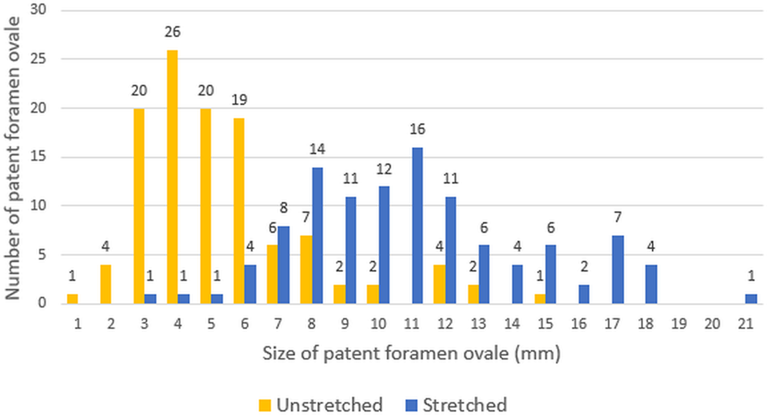 Distribution of PFO sizes between unstretched and stretched measurements. Distribution of the number of patients for each PFO size in mm. In yellow, the unstretched diameter opening, measured using echocardiography. In blue, the stretched diameter opening, measured during the closure procedure using a guidewire
