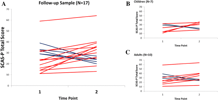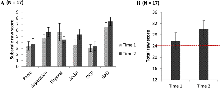 Data for the follow-up sample are summarized in Table 1. Mean age difference from Time 1 to Time 2 was 3.75 years (SD = 0.43). At time point 1 mean RCPM score was 17.56 out of a maximum possible score of 36, and mean BPVS raw score was 84.59 indicating an average verbal mental age of 5 years 7 months. Neither RCPM nor BPVS scores were significantly correlated to SCAS-P total score at Time 1 (BPVS: r(15) = 0.273, p = .289; RCPM: r(15) = 0.045, p = .869) or Time 2 (BPVS: r(15) = 0.179, p = .492; RCPM: r(15) = − 0.305, p = .251). However, medium effect sizes for the correlations between Time 1 anxiety and BPVS score and Time 2 anxiety and RCPM scores were found. This suggests that greater anxiety may be associated with greater verbal ability, but that poorer non-verbal ability is associated with greater anxiety at follow-up. This appears to present a conflicting picture in terms of the associations between cognitive abilities and anxiety based on effect sizes and is interpreted with caution.