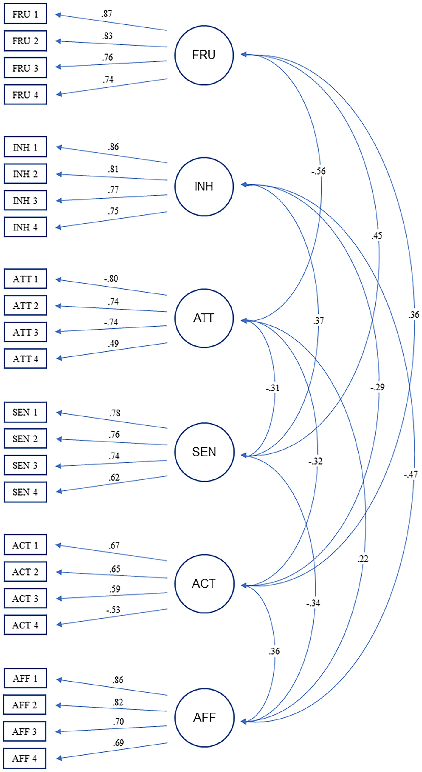 Results of the final measurement model for the 24-item version. Values represent standardized covariances and factor loadings. Correlations beneath .20 are not reported. FRU Anger/Frustration, INH Behavioral Inhibition, ATT Attention/Persistence, SEN Sensory Sensitivity, ACT Activity Level, AFF Affiliation