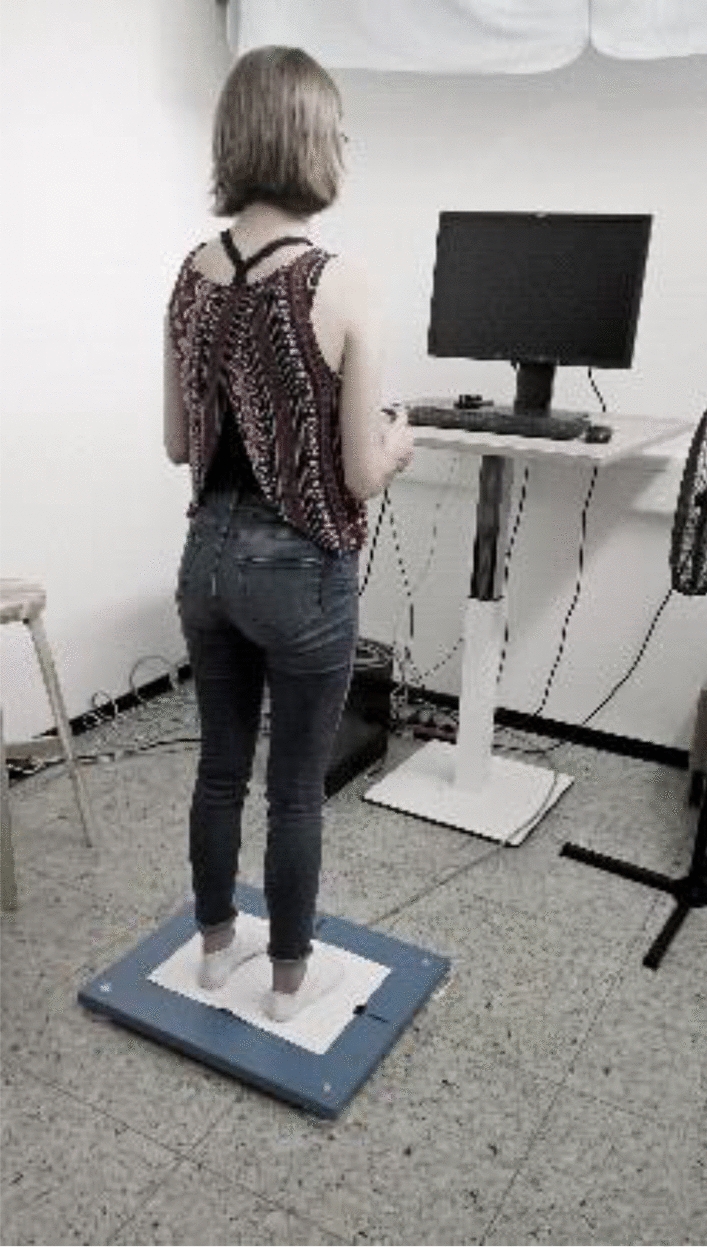 Experimental setup consisting of the force plate and the stimulus presentation display screen. The paper sheet on the force plate, on which the participant is standing, served for marking the foot prints to record and standardize each participant’s standing position. This allowed participants to step off the force plate during pauses in the experimental session