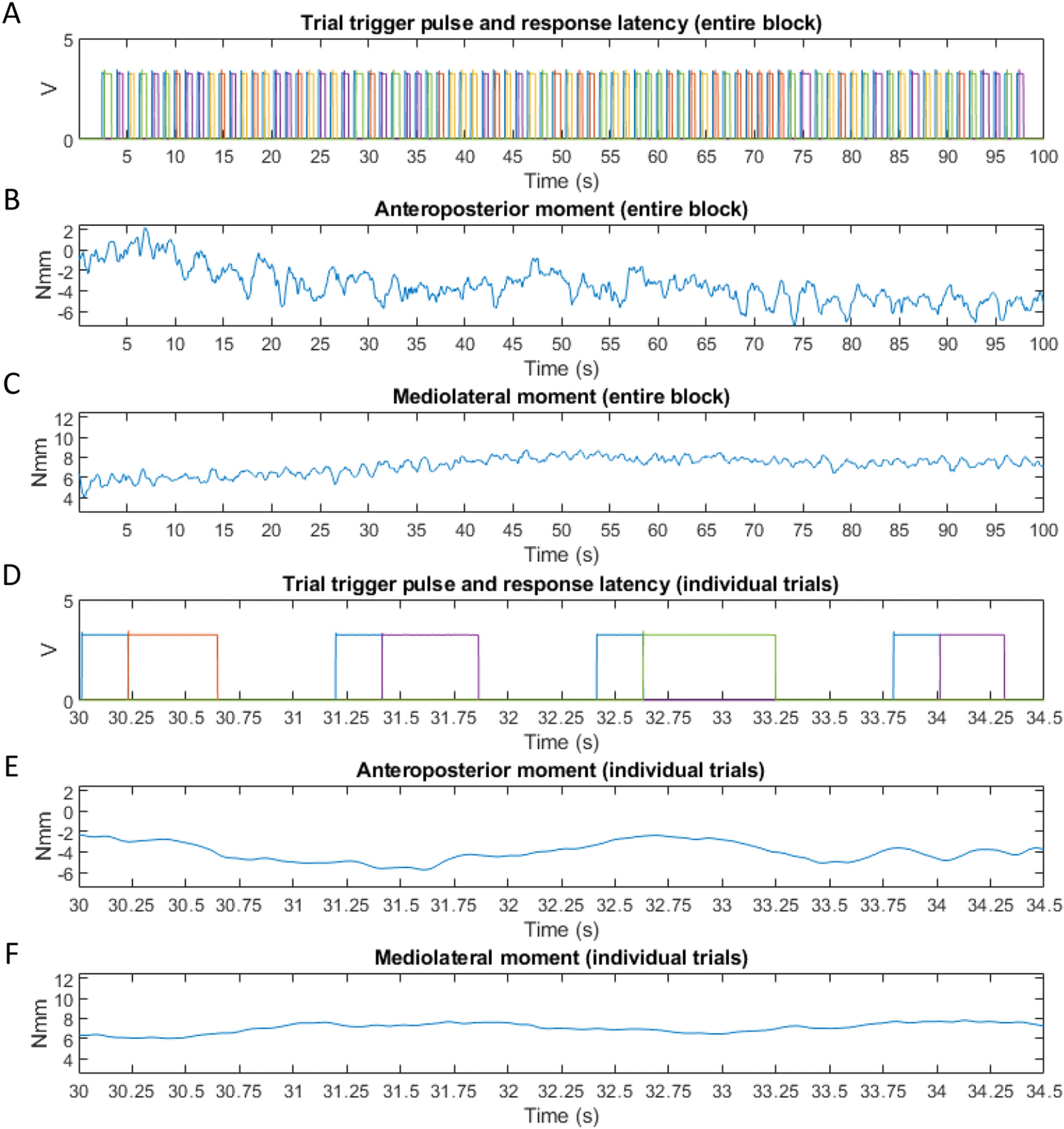 Illustrative event pulses and anteroposterior and mediolateral moments for an entire block (panels A–C) as well as for selected trial segments within this block (panels D–F) of an individual participant. Panels A and D (D is a temporal subset of A) show the period of the fixation cross (light blue colored trigger pulses) followed by the latency period of the subsequent manual response (red, green, purple, yellow colored pulses). Colored periods indicate response latencies encoding the specific target stimulus condition (congruent/incongruent; left/right). Panels B and E show the fluctuation of the anteroposterior moment, while the mediolateral moment is shown in the Panels C and F (color figure online)