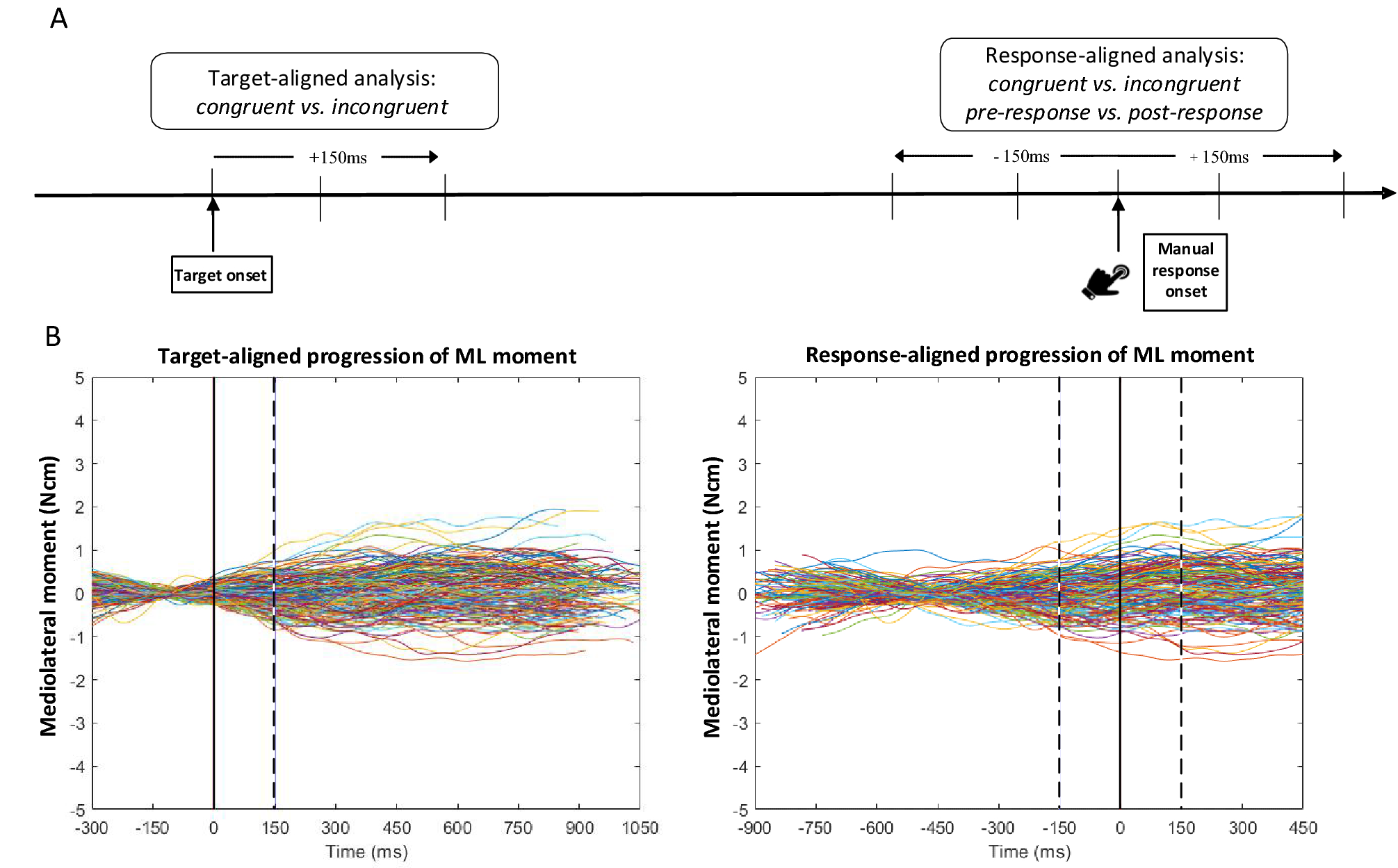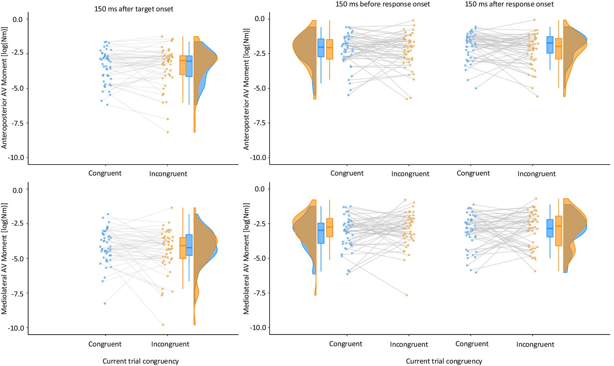 While we hypothesized that resolution of response selection conflict would interfere with the control of body sway based on a wealth of previous literature on such interactions assessed by aggregating across much longer time periods, it was important to show that our effects would be related to the occurrence of specifically defined cognitive processes. Moreover, while we could predict that the cognitive process of response selection is critical, based on neurocognitive findings (see Cespón et al., 2020, for a review), there was no prior knowledge of which aspect of body sway control would be susceptible and sensitive to any cognitive interference. Therefore, we analysed the average moment in each direction as an expression of balance-related state, and we analysed the variability of the moments as an indication of the balance control effort imposed on body sway.