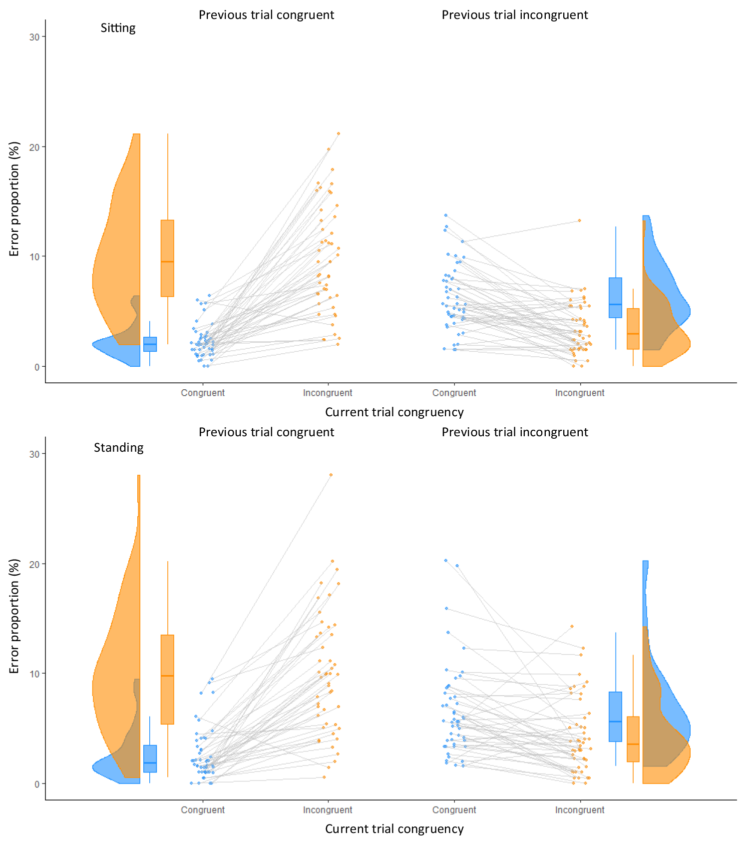 Raincloud plots for error proportions in the Simon task during sitting (top panels) and standing (bottom panels) as a function of current trial congruency and congruency of the previous trial. Panels on the left show performance when the previous trial was congruent, panels on the right when the previous trial was incongruent. Data in blue indicate performance in congruent trials, incongruent trials on orange (color figure online)