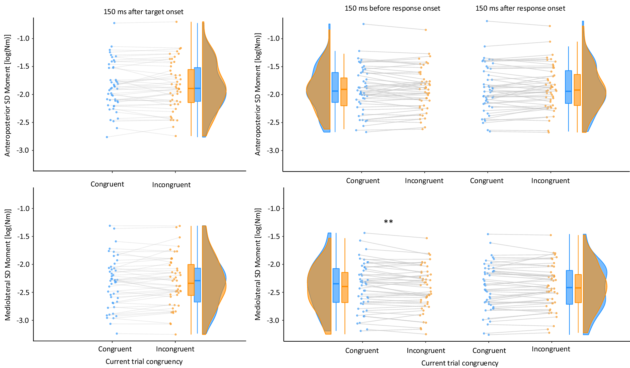 Raincloud plots for the log-transformed standard deviation (SD) of the moment in the anteroposterior direction (top panels) and the mediolateral directions (bottom panels) as a function of congruency of the current trial (only for trials where the previous trial was congruent) for each extracted time bin (left panels: across 150 ms after target onset; middle panels: across 150 ms before response onset; across right panels: 150 ms after response onset). Data in blue indicate performance in congruent trials, incongruent trials on orange. Double-asterisks indicate p < 0.01