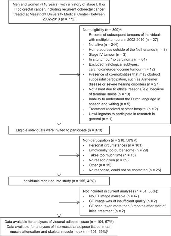 In total, 373 eligible CRC survivors were invited to participate and 155 were recruited (response rate: 42%; Fig. 1). A total of 51 participants (33%) were excluded from the current analyses for having no CT image at CRC diagnosis (n = 47), or a CT image of insufficient quality or taken more than 3 months after start of treatment (both n = 2). Three participants were further excluded from the analyses of muscle tissue parameters, due to skeletal muscle being not fully visible on the CT image. Non-participants had a higher mean age at diagnosis (67.8 years) than participating CRC survivors included in the analyses (64.3) and those without CT image data (64.6; Table 1). Further, compared to included survivors and non-participants, CRC survivors without CT image data had a higher time since diagnosis (differences: 1.5 and 1.0 years, respectively) and less often colon cancer and stage III CRC (differences >10%). In addition, included CRC survivors without CT image data were less often treated with chemotherapy, and reported less often a lower education level and more often ≥2 comorbidities than survivors included in the analyses (differences >10%).