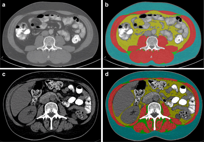 Computed tomography (CT) images showing the measurement of skeletal muscle and different types of adipose tissue at the level of the third lumbar vertebra (L3); a and b show the original and tagged (i.e., colored) CT images, respectively, of one included CRC survivor [man, 50 years old at CRC diagnosis, self-reported body mass index (BMI) at diagnosis: 27.6 kg/m2] with a relatively high skeletal muscle index (67.0 cm2/m2); area of visceral adipose tissue and intermuscular adipose tissue: 118.3 and 10.1 cm2, respectively; mean muscle attenuation: 35.9 Hounsfield units (HU); c and d show the original and tagged CT images, respectively, of one included CRC survivor (woman, 49 years old at CRC diagnosis, BMI at diagnosis: 21.0) with a relatively low skeletal muscle index (30.8 cm2/m2); area of visceral adipose tissue and intermuscular adipose tissue: 52.9 and 20.4 cm2, respectively; mean muscle attenuation: 27.2 HU. Within the tagged figure, yellow represents visceral adipose tissue; blue represents subcutaneous adipose tissue; green represents intermuscular adipose tissue; and red represents skeletal muscle. (Color figure online)