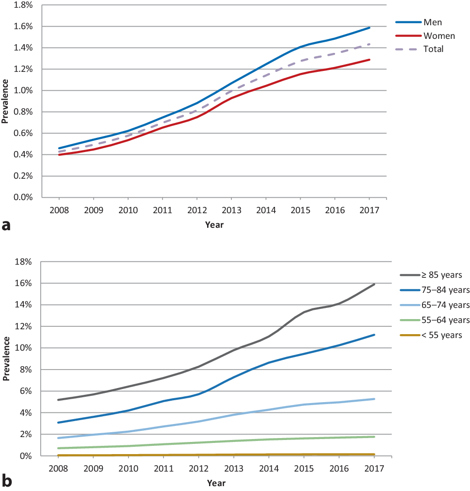 Trends in prevalence of atrial fibrillation in primary care, stratified by a sex and b age. (This figure was reprinted from: Joosten LPT, van Eerde EJB, Rutten FH, Geersing GJ. Ontwikkelingen in prevalentie van atriumfibrilleren en anti-trombotica voorschriften. In: De Boer AR, van Dis I, Visseren FLJ, Vaartjes I, Bots ML (eds). Hart- en vaatziekten in Nederland 2019, cijfers over incidentie, prevalentie, ziekte en sterfte. The Hague: Dutch Heart Foundation; 2019. Copyright, with permission from the Dutch Heart Foundation.)