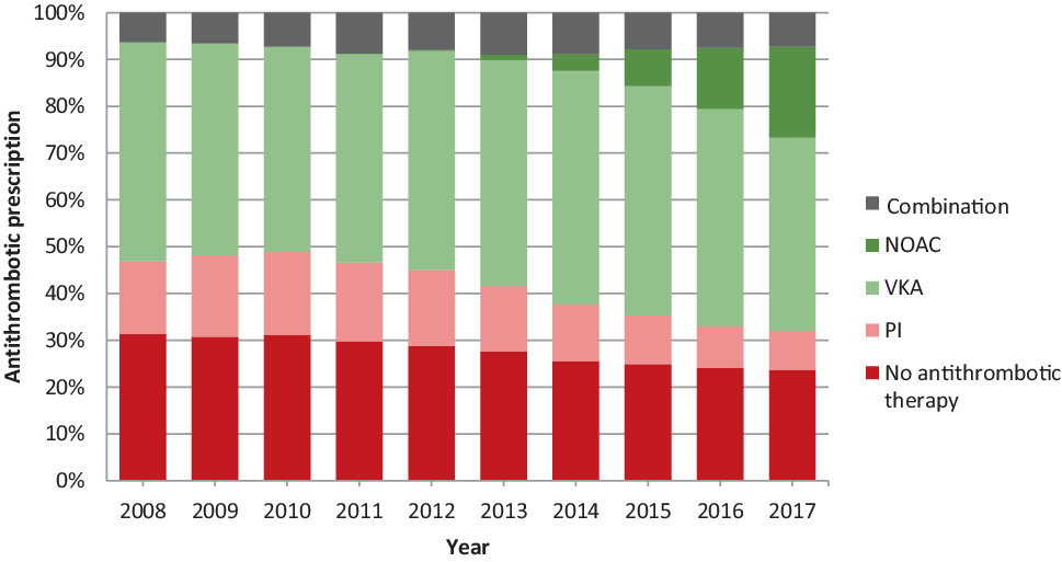 Patients with AF were identified in the JGPN database by using the International Classification of Primary Care (ICPC) code K78 (AF or atrial flutter), from 1 January 2008 to 31 December 2017 [15]. The following variables were extracted: sex, age, medical history using ICPC codes (see Table S1 in Electronic Supplementary Material) and cardiovascular medication prescriptions (see Table S2 in Electronic Supplementary Material). Medication prescriptions were classified according to the Anatomical Therapeutic Chemical classification system. Antithrombotic therapy was divided into three categories: VKA, NOAC and platelet inhibitor therapy. Medication prescription was not necessarily initiated by the GP but may have been started by a hospital specialist and continued by the GP.
