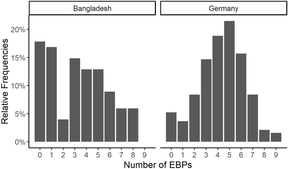 To answer Research Question 1a concerning differences in attitudes between countries, the means of the four EBPAS subscales for which partial scalar MI was given were compared using t-Tests. The significance level was adjusted to 0.0125 to correct for multiple testing. Research Question 1b concerned the number of EBPs used in Bangladesh and Germany. Mean numbers of different EBPs were compared by t-Test. Research Questions 1c concerned differences in the usage of different types of EBPs. Differences between frequencies of usage for the nine individual EBPs were tested by Fisher’s exact test. The significance level was adjusted to 0.0056 to correct for multiple testing.