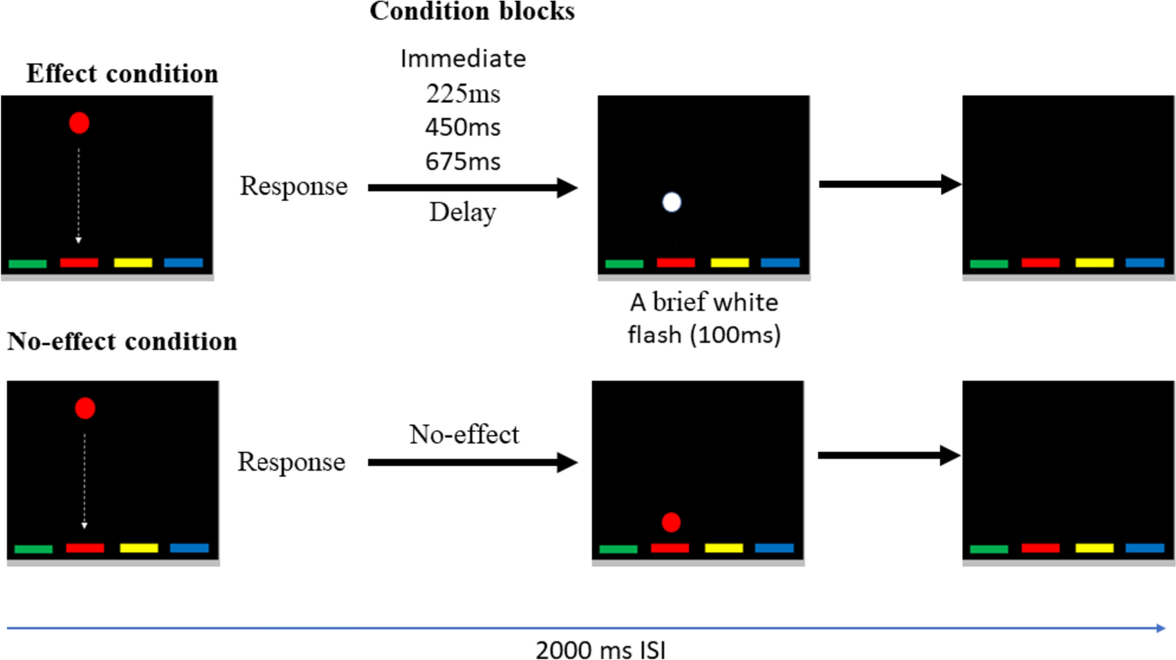 Notably, we manipulated the temporal contiguity between the appearance of the visual action-effect and the participants’ responses (the circle changed its color to white for 100ms and disappeared, experienced as a brief white flash). Specifically, the perceptual effect appeared immediately after the participant’s response. Three additional experimental conditions were used with varying delays between their response and the appearance of the effect: 225ms, 450ms, and 675ms lagged effect conditions. In addition, the No-effect condition was used as a control, in which no flash was presented following a response, and the circle continued its descending path. The ISI was 2000ms in all condition blocks and independent of RT. Participants completed each of the five effect conditions in separate blocks of trials; a Latin Square determined the order of the blocks.