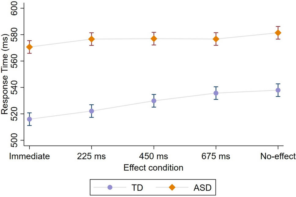 These results suggest that an (immediate) action-effect enhances the motor performance of individuals with ASD. Still, their RTs are less modulated by different levels of action effect delays.
