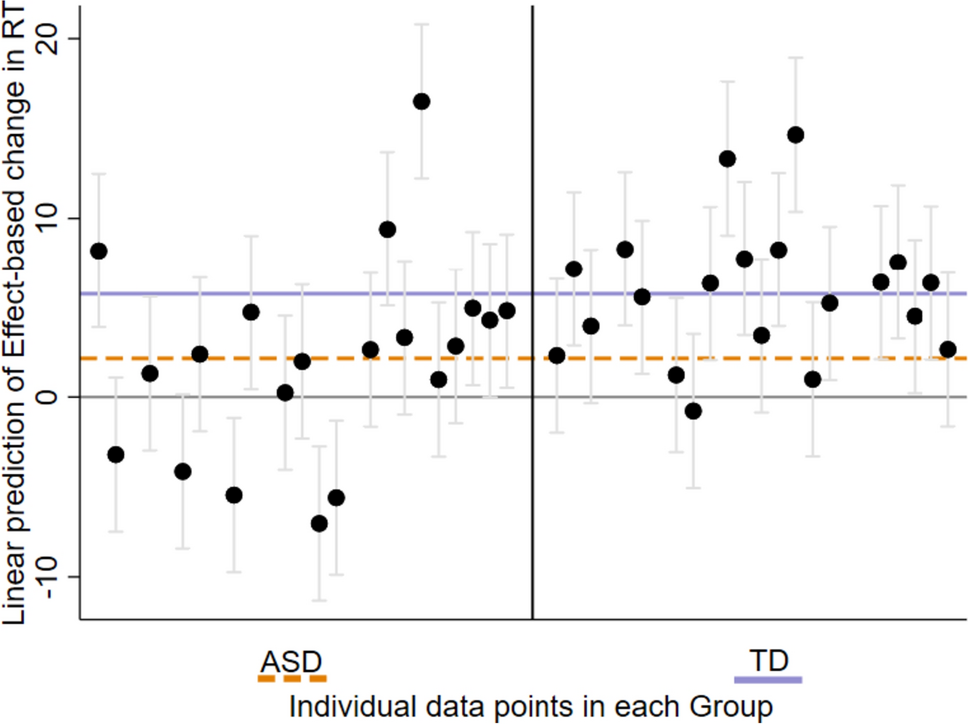 Individual data points of ASD and TD participants describing linear prediction of their averaged change in RTs as a function of an increase in action-effect delay (calculated using ‘margins’ command with ‘dydx’ option in STATA-15 software). The solid lavender horizontal line represents the averaged change in RTs as a function of increased delay for the TD group. The orange dashed horizontal line represents the averaged change in RTs as a function of increased delay for the ASD group. Data points for individuals with ASD are on the left and for the TD on the right