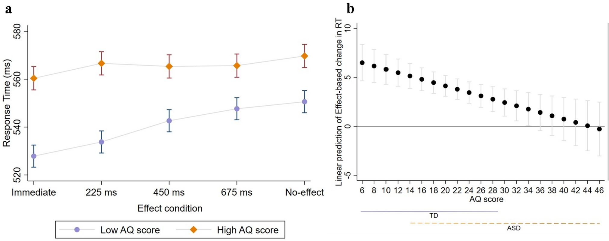 To explore whether Autistic Quotient (AQ) scores were associated with modulating the impact of action-effect and its temporal contiguity on RTs, we initially assigned all participants to High and Low AQ groups according to the Median score (Med = 18). A two-way mixed model ANOVA was carried out on RTs with Effect as a within-subject factor with five levels (Immediate, 225ms, 450ms, 675ms, and No-effect) and AQ as a between-subject factor with two levels (High vs. Low). The analysis revealed a significant difference between the High and Low AQ groups [F(1,152)= 4.46, p = .041, η2p = 0.1], showing slower RTs for the High (M = 565, SD = 35) compared to the Low (M = 540, SD = 40) AQ group. Interestingly, similar to the differences found between TD and ASD groups, there was a significant interaction between Effect and AQ [F(4,152)=4.5, p = .001, η2p = 0.1]; see Fig. 4a]. To further explore whether AQ score modulated the predicted change in RTs as a function of an increase in action-effect delay, we used a linear mixed effect model of RTs on Effect and AQ score (as continuous predictors), with a random intercept by the participant. The interaction between AQ score and Effect was found significant [(Coef. = − 0.16, p = .001, CI95% (−0.27, − 0.06)] suggesting that overall, the predicted amount of change in RTs as a function of an increase in action-effect delay level was smaller as the AQ score increased (Fig. 4b). The findings echo the observed differences between the TD and the ASD groups.